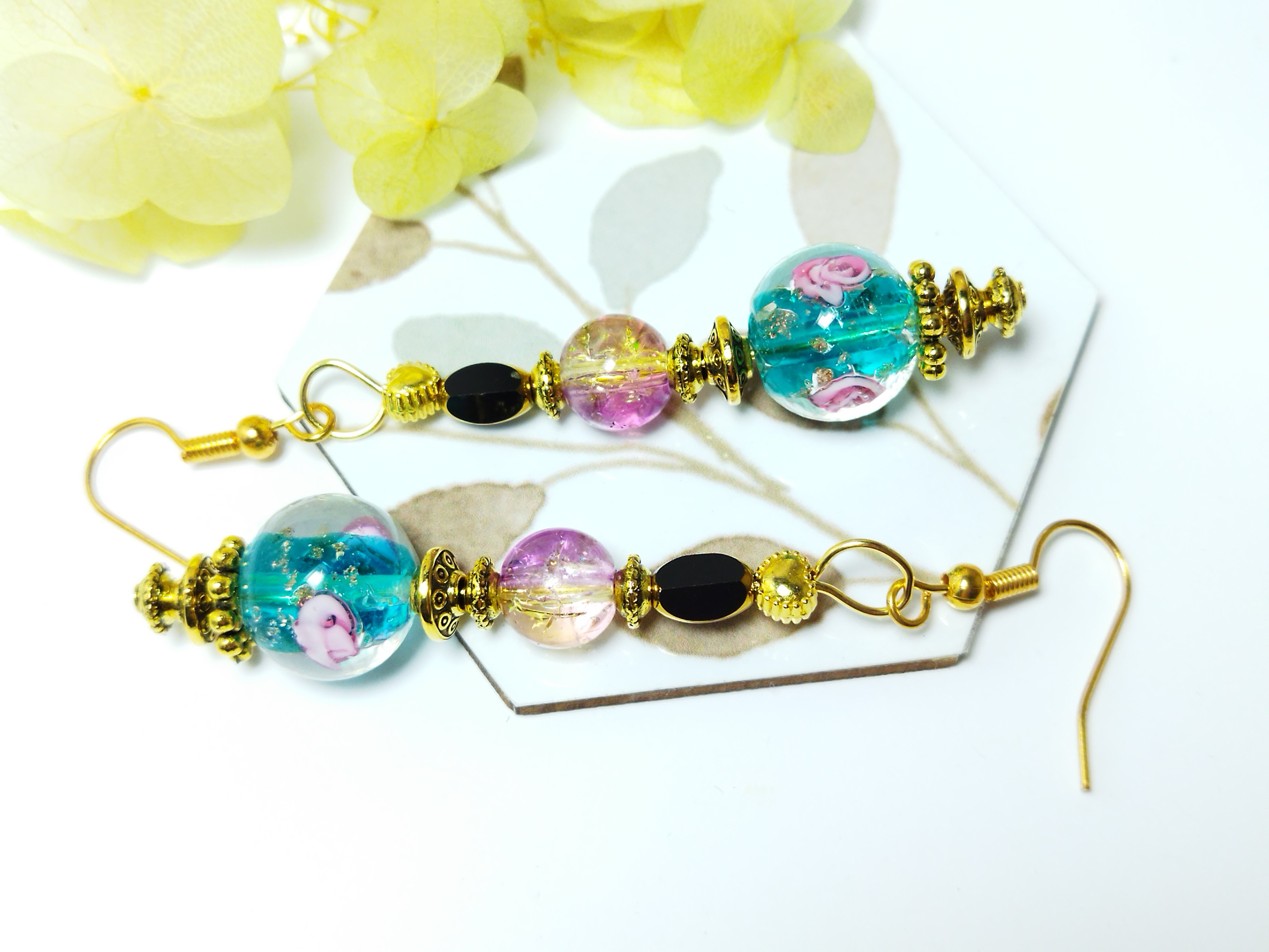 Quelle élégance pour ces jolies boucles d'oreilles pendantes ornées de perles en verre sur fond turquoise, pailletées or, et agrémentées de roses couleur rose pastel !