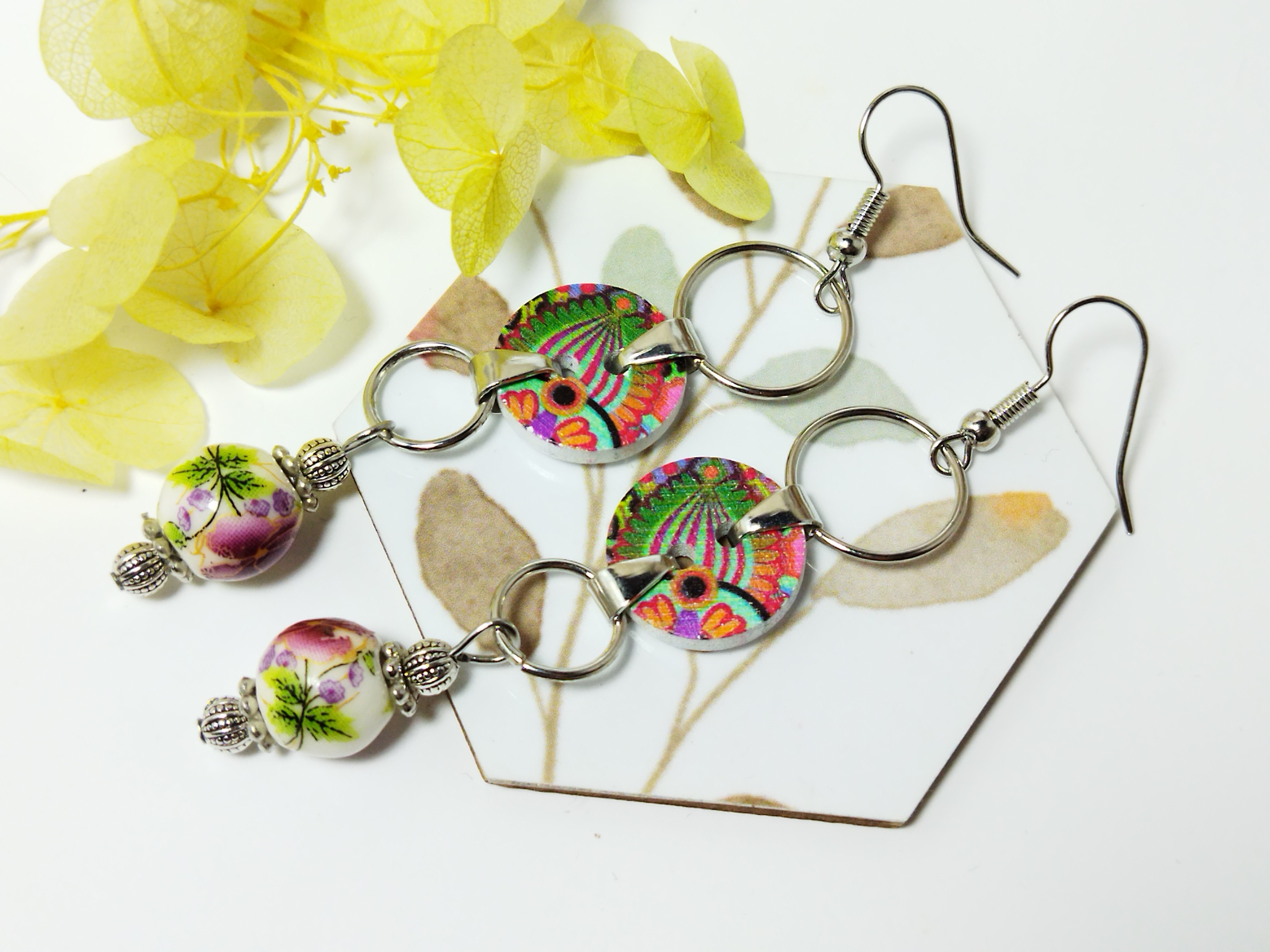 Ces jolies boucles d'oreilles pendantes sont ornées de boutons fantaisie en bois multicolores, de perles en céramique, illustration nature, et d'accessoires d'ornement en acier inoxydable argent ancien, style vintage.
