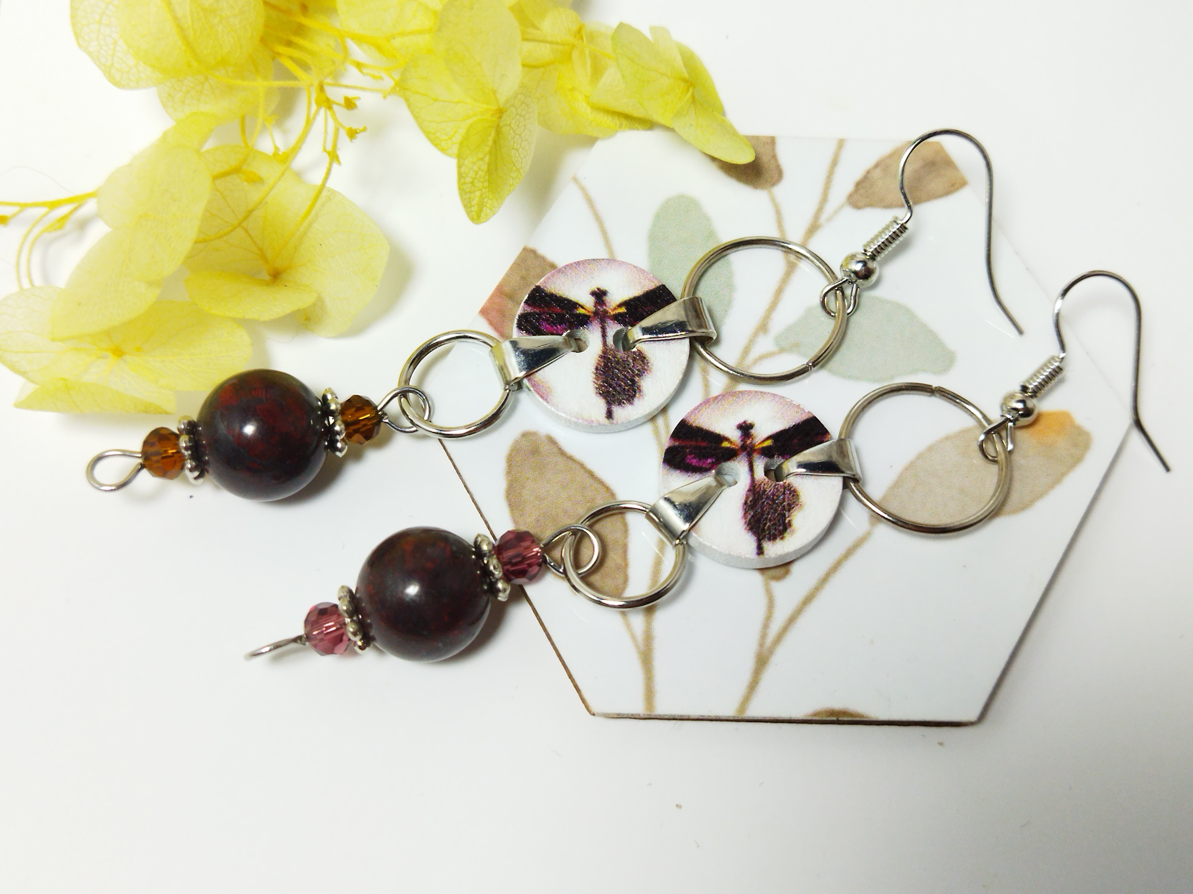 Prenez votre envol avec ces jolies boucles d'oreilles pendantes, ornées de boutons fantaisie en bois, illustrés par une libellule, de pierres naturelles Jaspe Rouge, de petites perles en verre avec dorures, et d'accessoires d'ornement en acier inoxydable argent ancien, au style vintage.