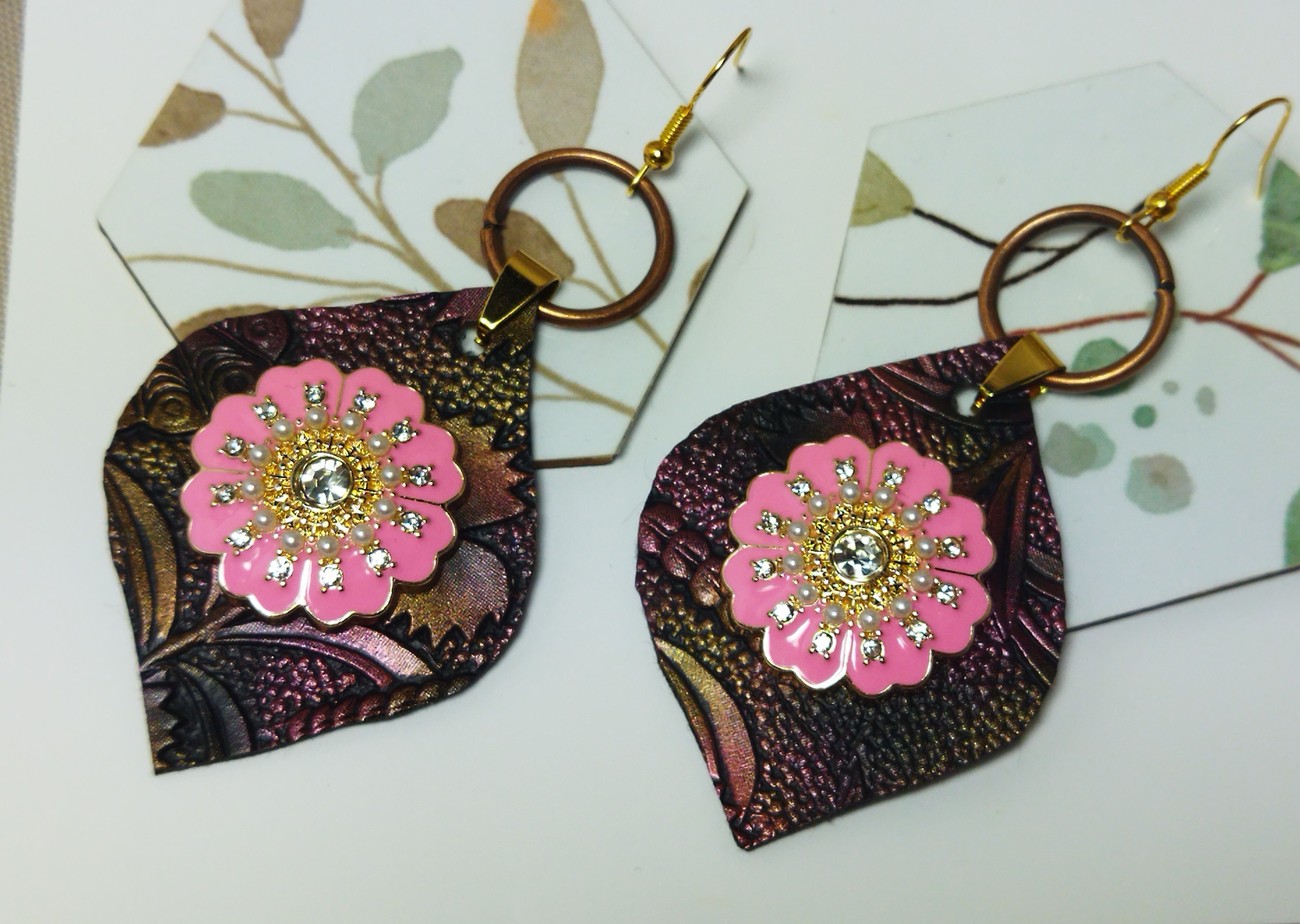 Allez vous résister à ces jolies boucles d'oreilles pendantes ornées d'un bouton fantaisie rose strass, reposant sur un tissu en simili cuir aux reflets changeants mauves avec motifs en relief.