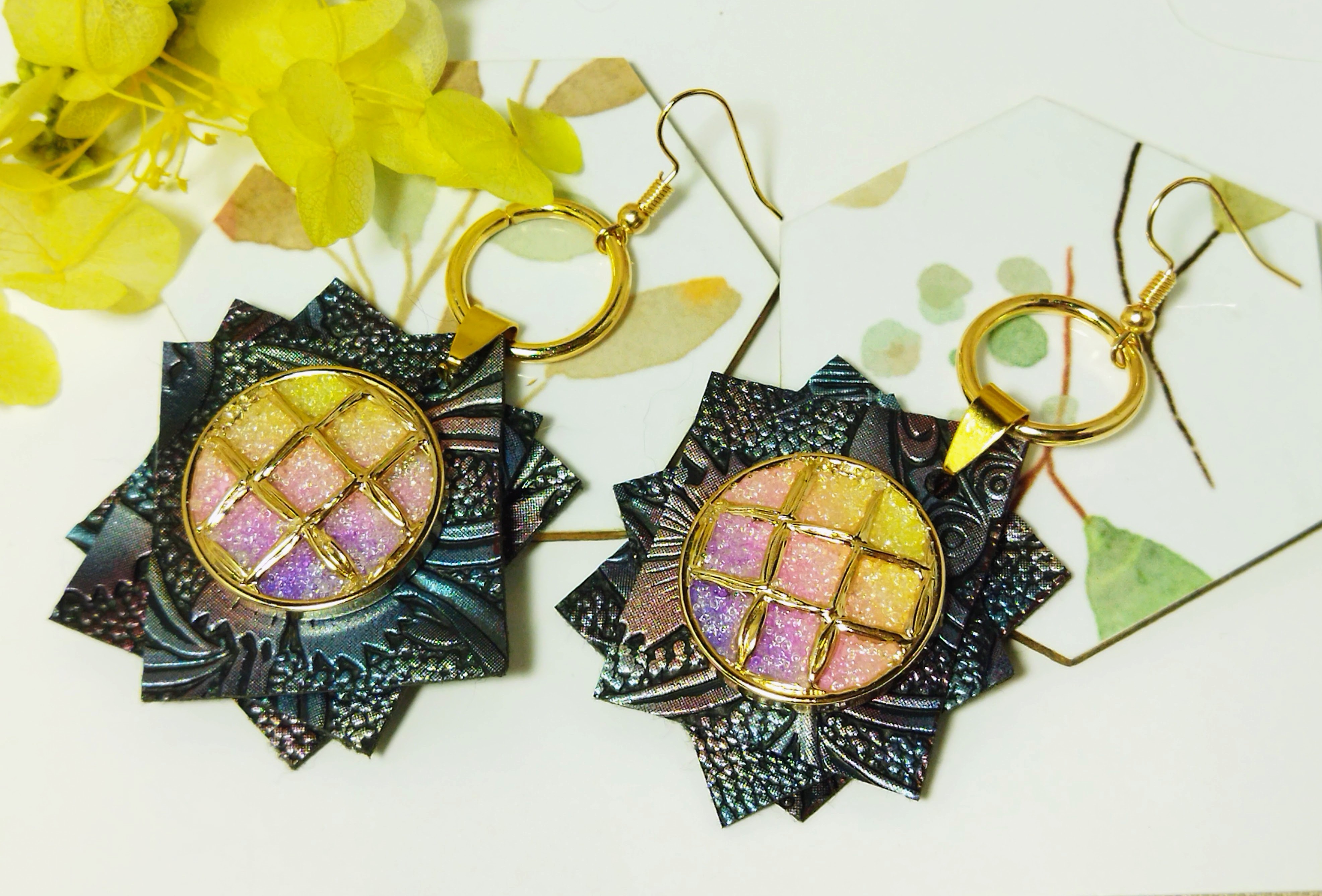 Offrez-vous un style original et atypique, avec ces jolies boucles d'oreilles pendantes ornées d'un bouton fantaisie violet dégradé, sur un tissu en simili cuir aux reflets changeants.