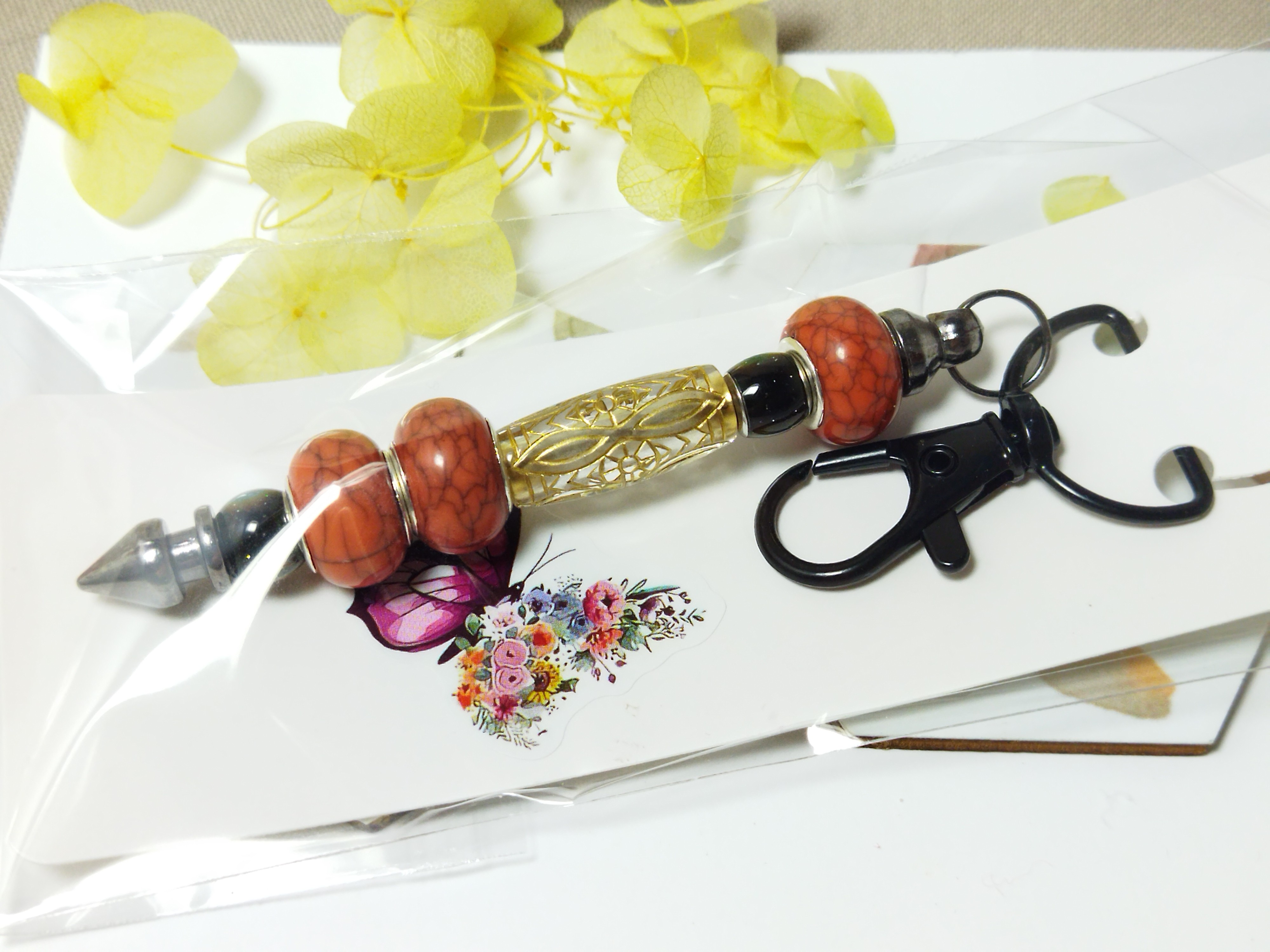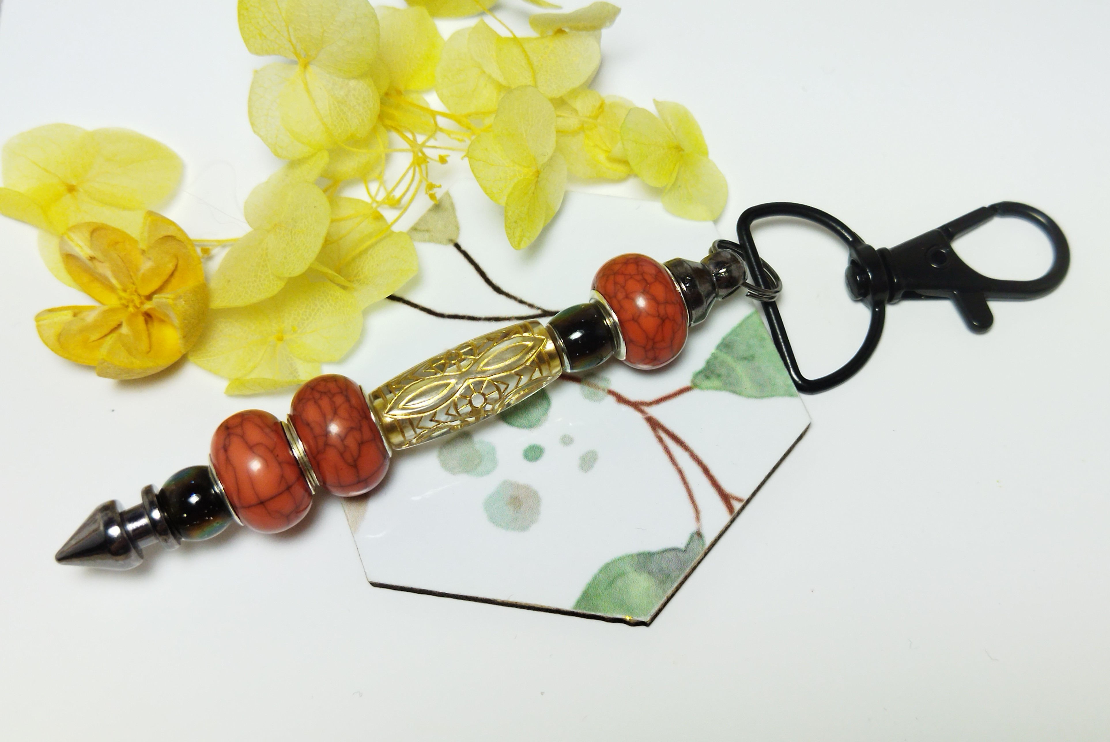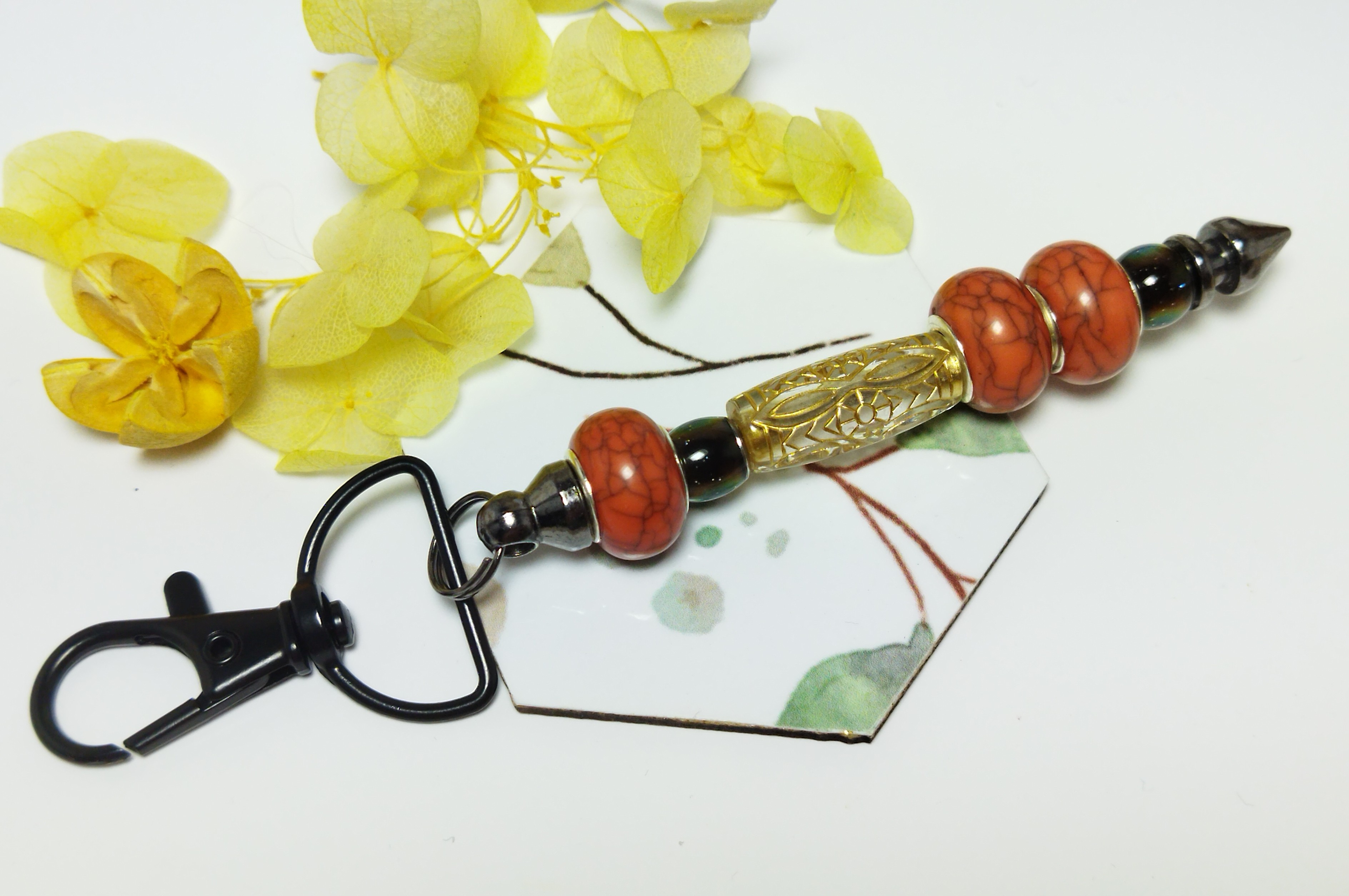 Couleurs d'automne pour ce joli bijou de sac, et porte clés, orné de perles en verre, en porcelaine et synthétique, et d'accessoires d'ornement en acier inoxydable noir.