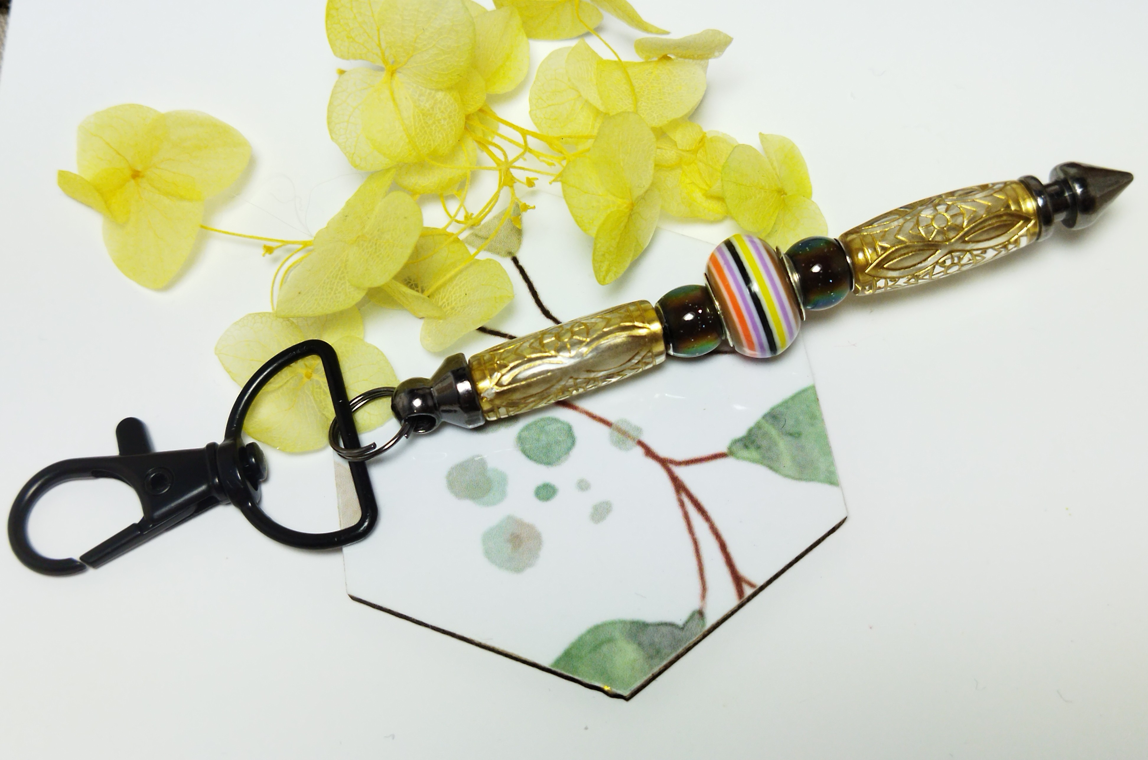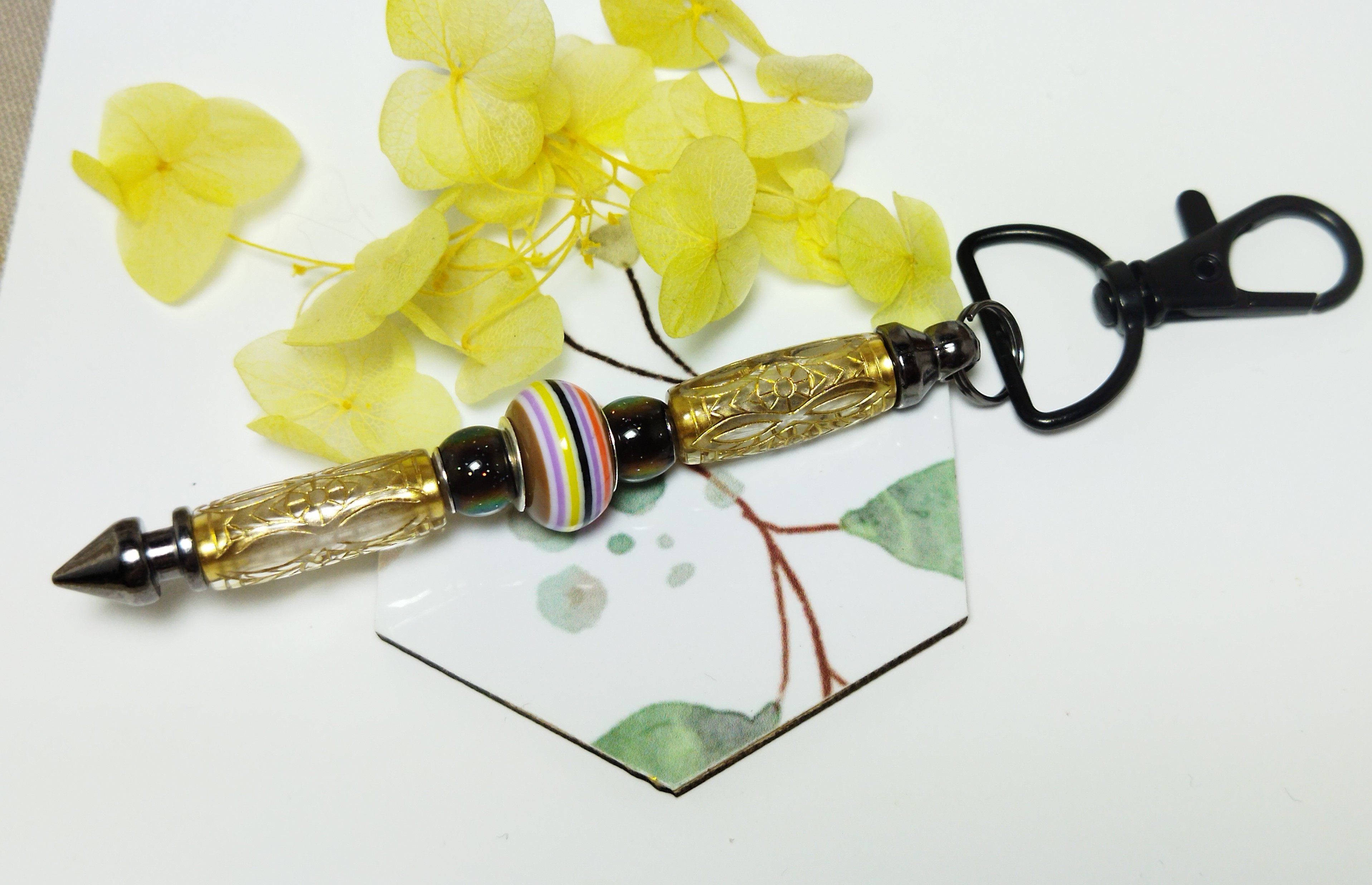 Très classe et élégance pour ce joli bijou de sac et porte clés, orné de perles en verre, en céramique et synthétique, et d'accessoires d'ornement en acier inoxydable gun et noir.