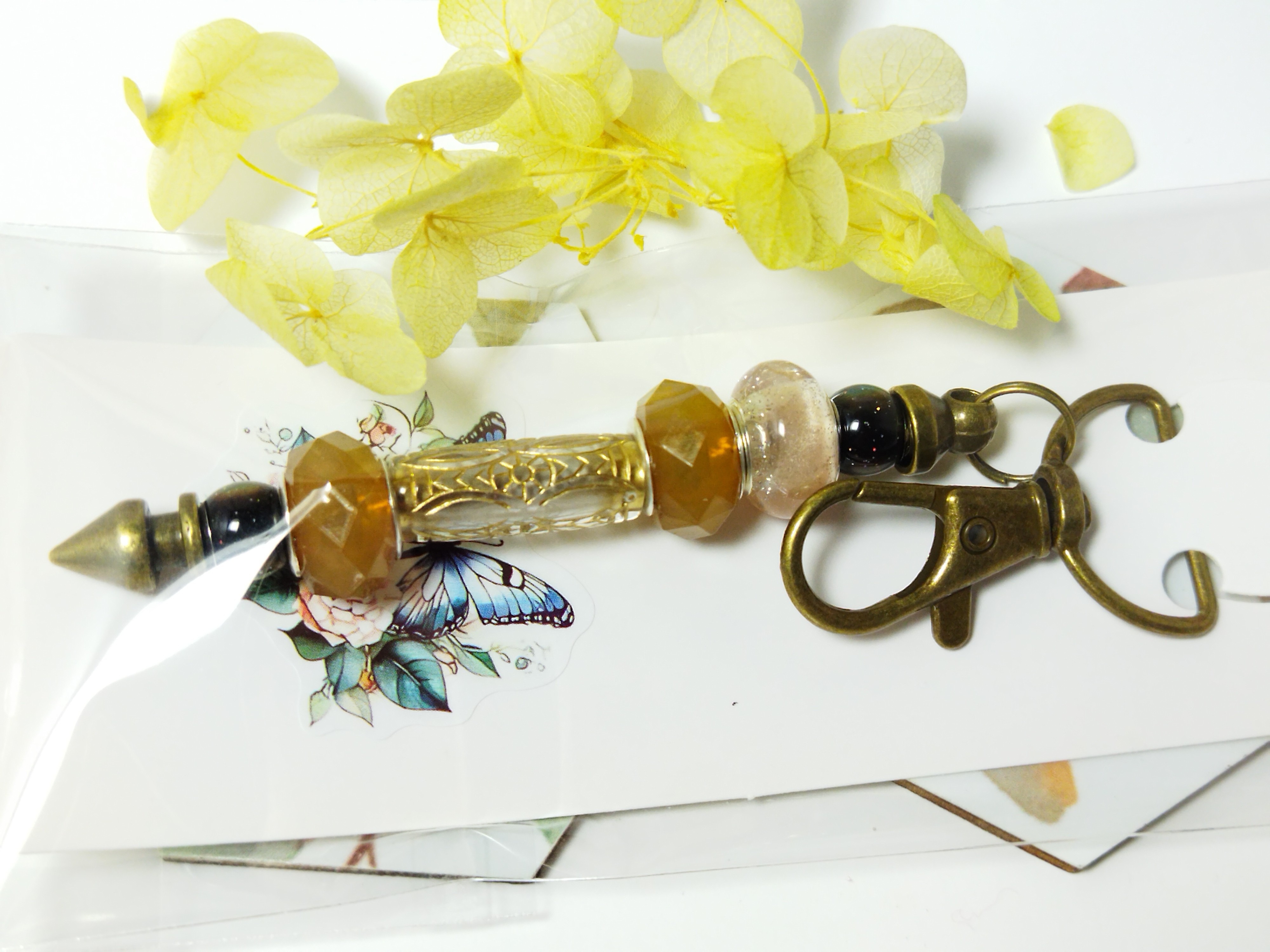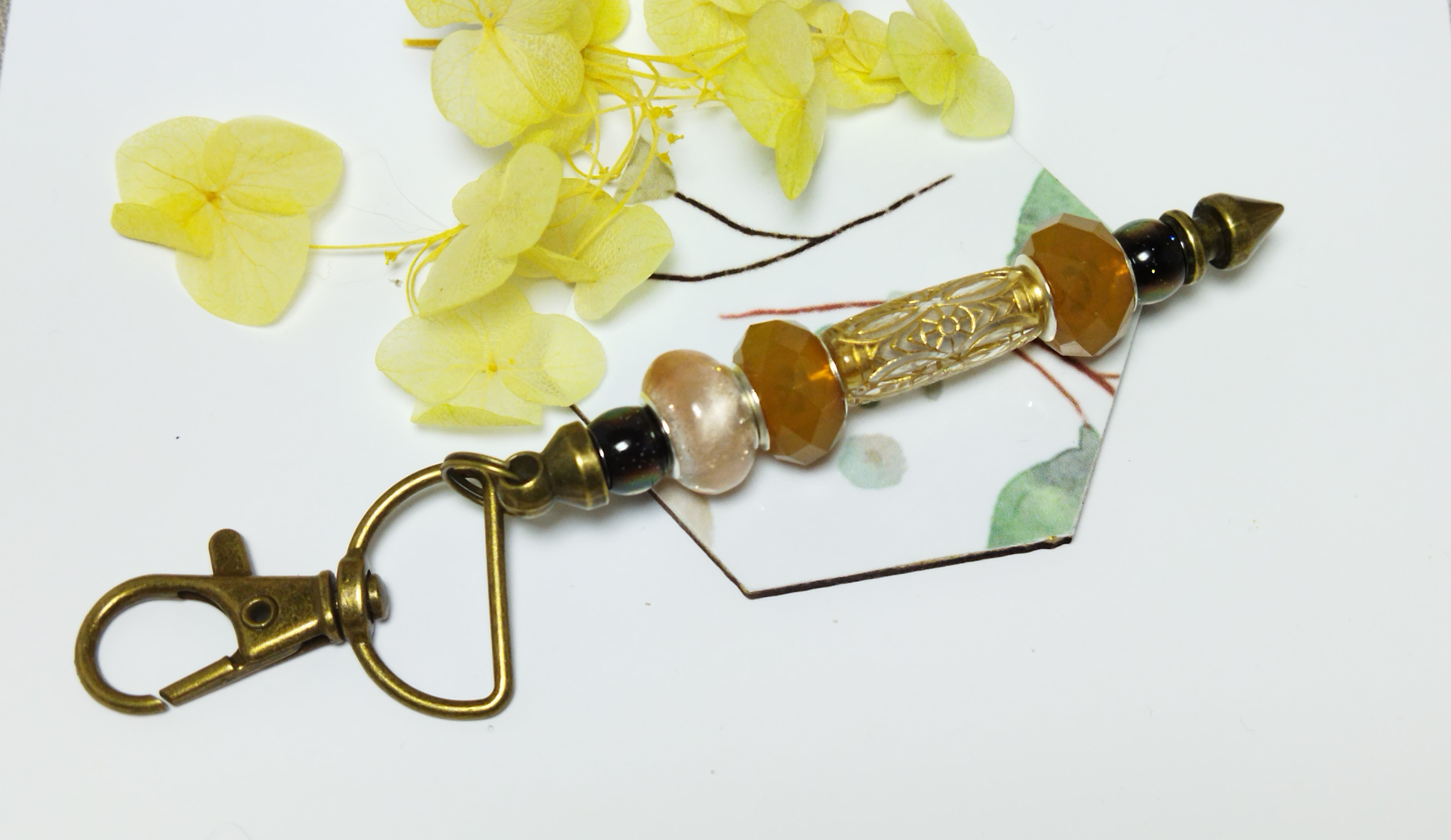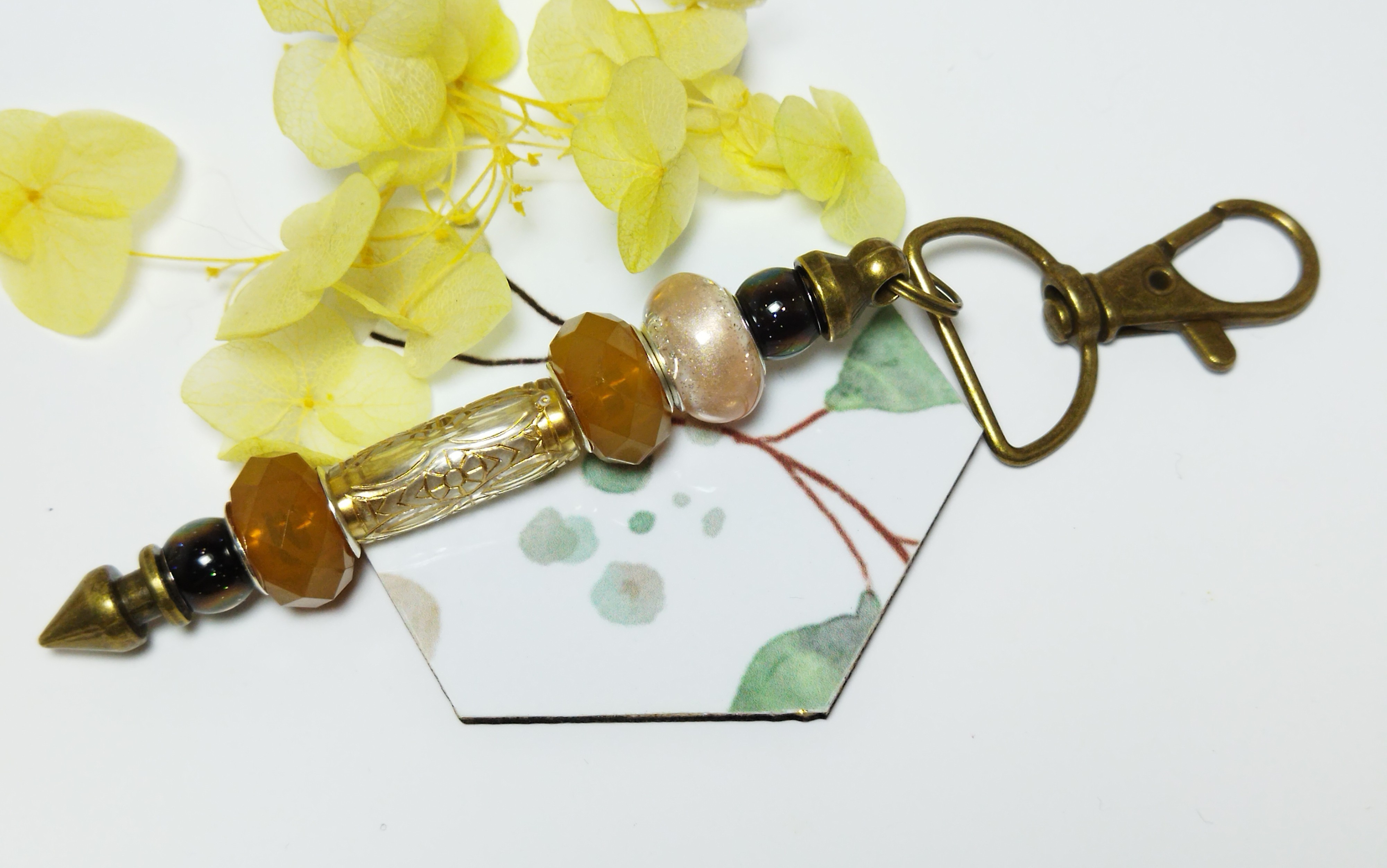 Couleurs automnales et festives pour ce joli bijou de sac et porte clés, orné de perles en verre marron et rose pâle à paillettes, et synthétique.
