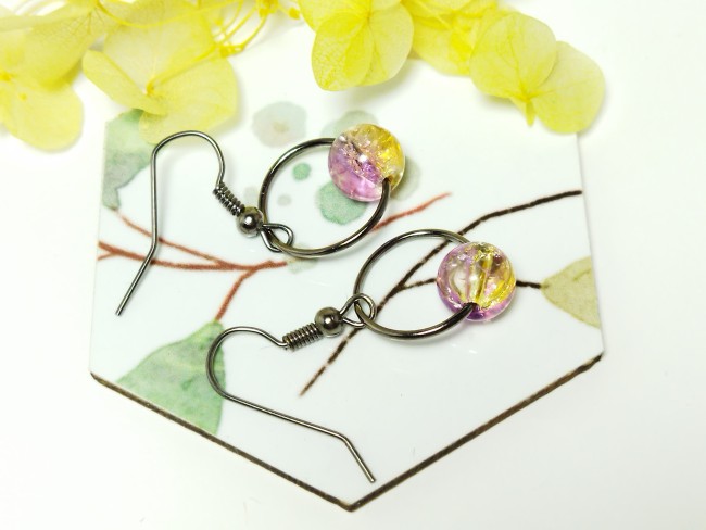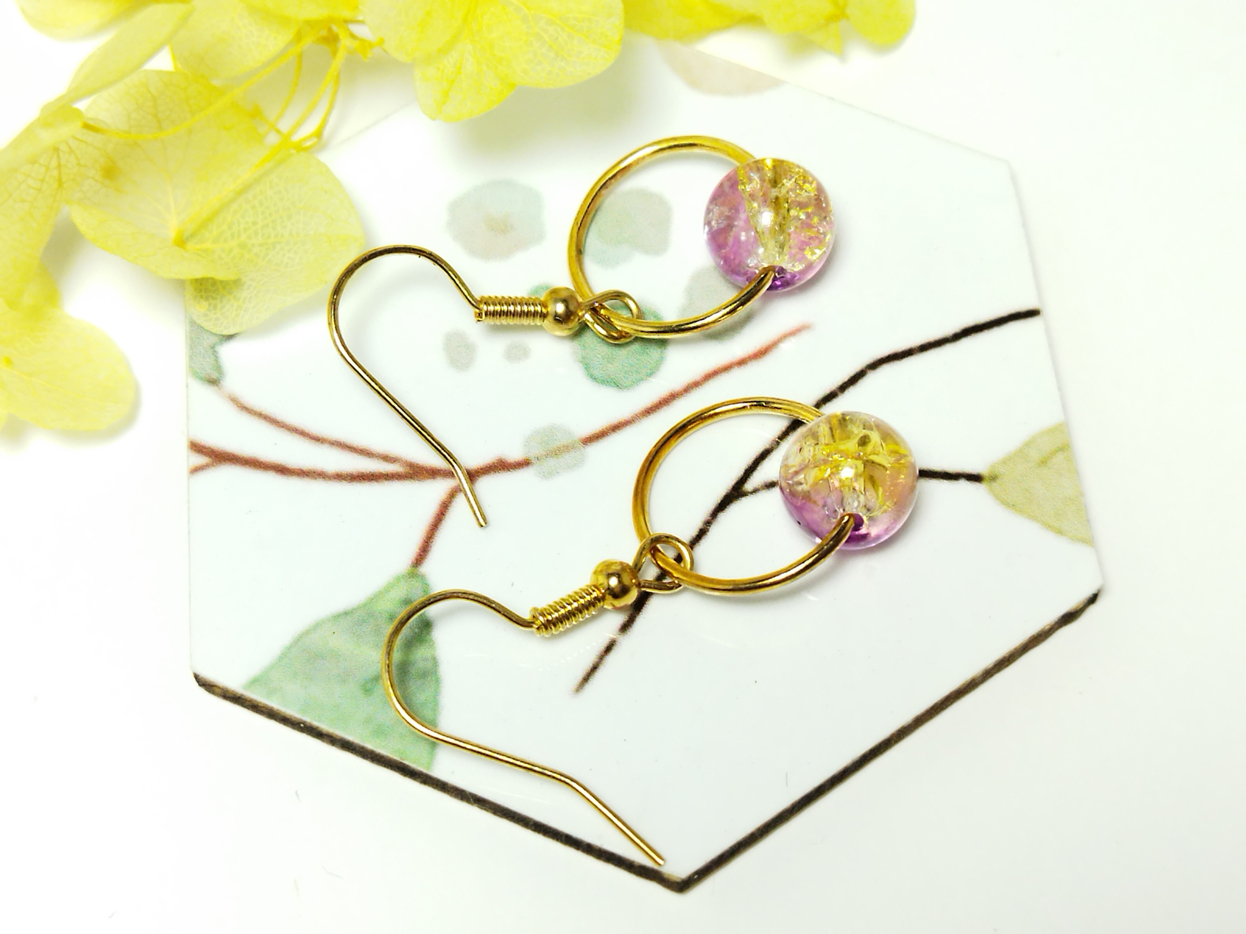 Deux modèles au choix pour ce lot de boucles d'oreilles courtes, ornées de perles en verre craquelé or et mauve, et d'accessoires d'ornement en acier inoxydable or antique et noir, plaqué or avec un poinçon pour les crochets hameçon.