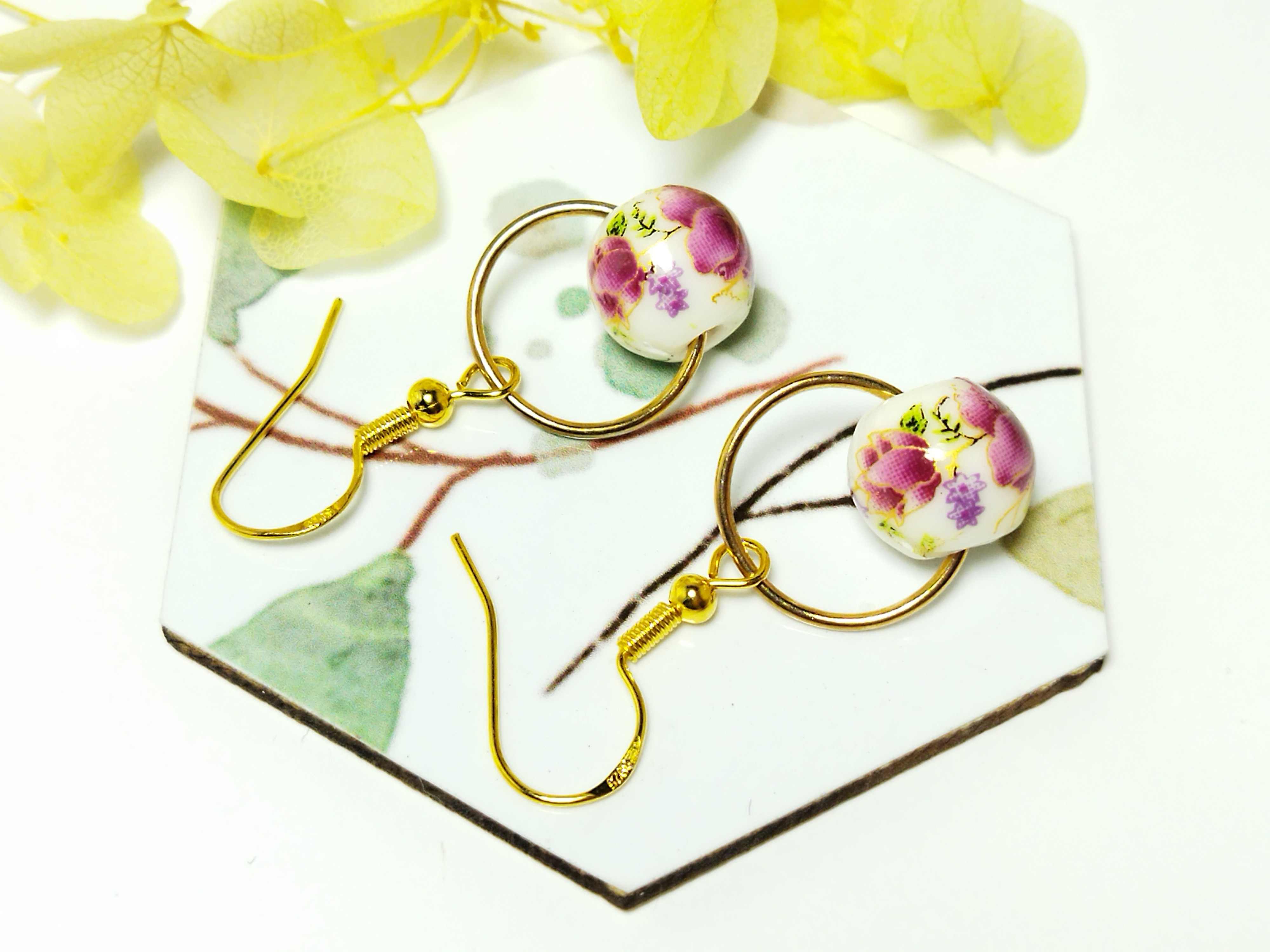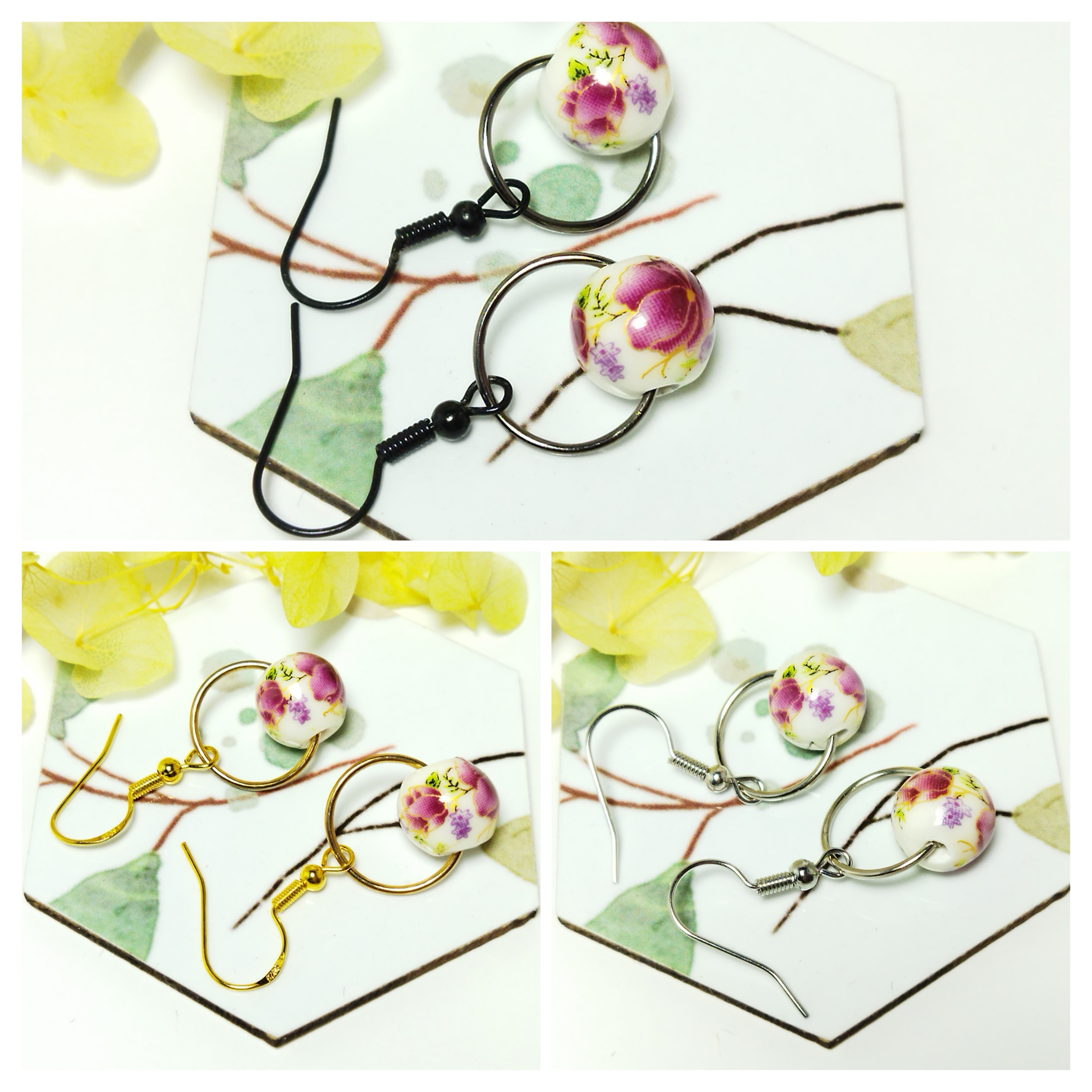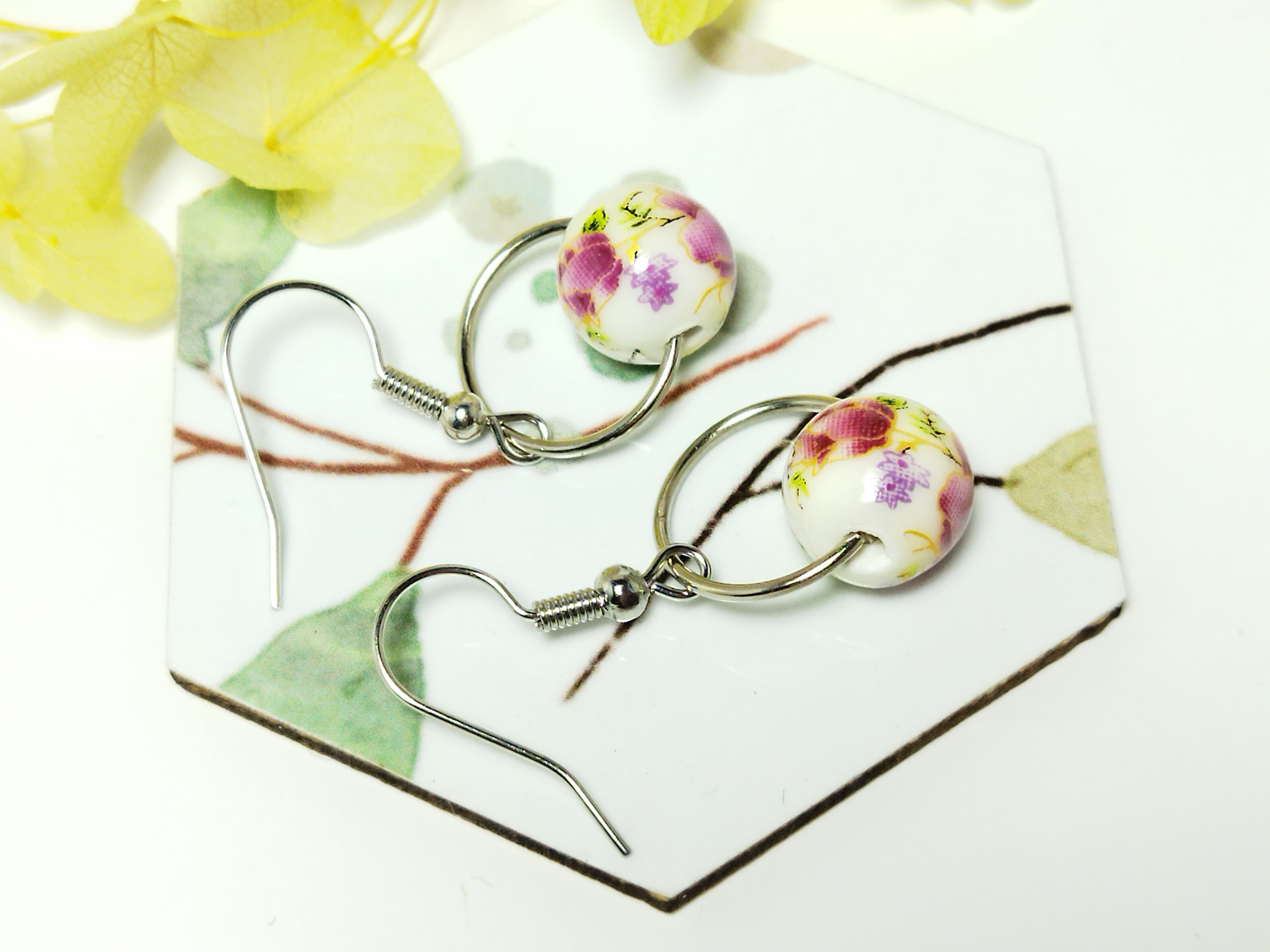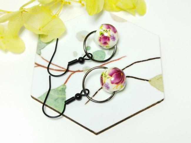 Chaque paire est ornée d’une perle ronde en céramique décorée de motifs floraux, aux nuances douces de rose, violet et vert, pour une touche romantique et féminine.