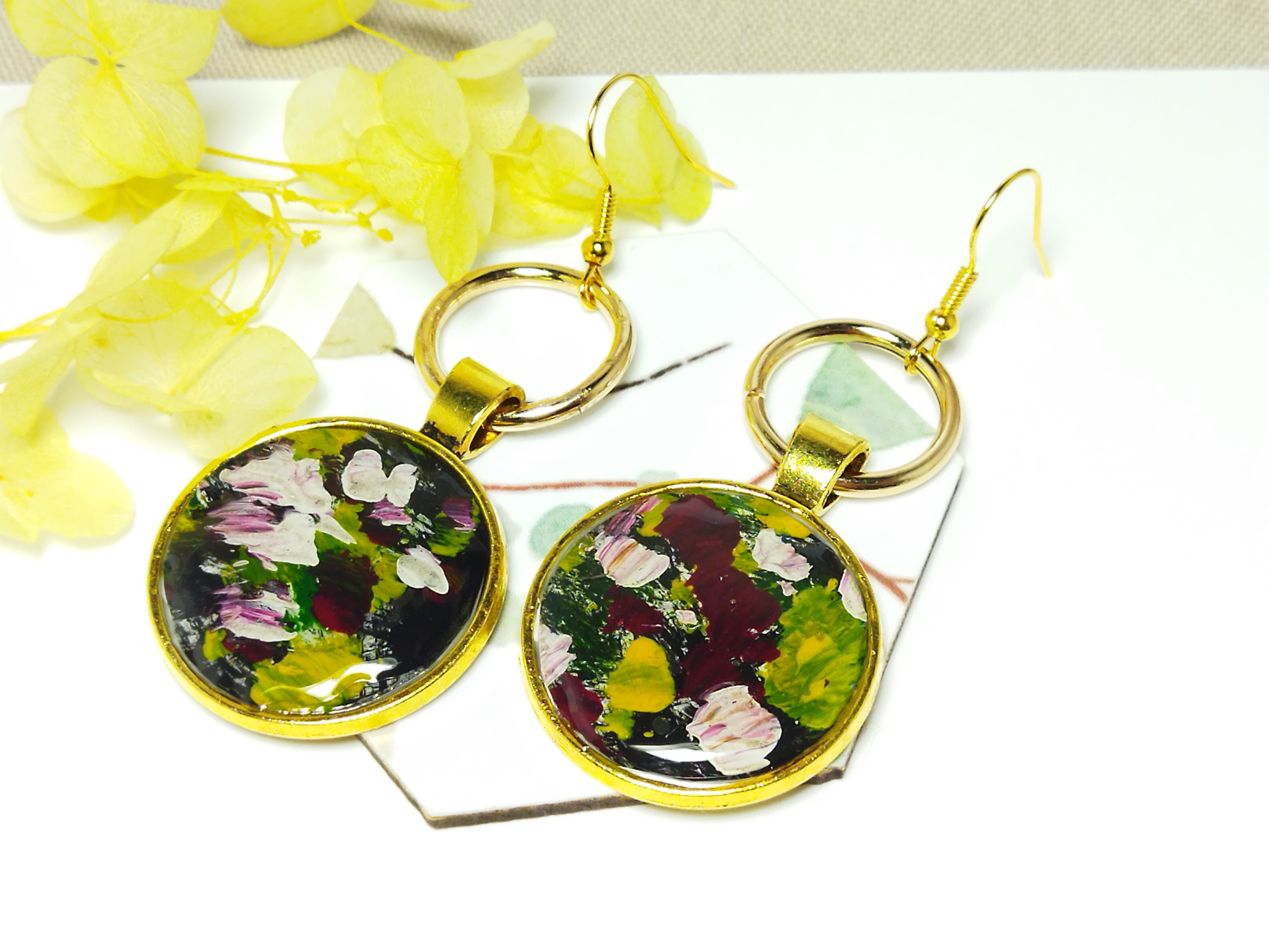 Boucles d’oreilles cabochons peinture gouache multicolore florale – résine structurée