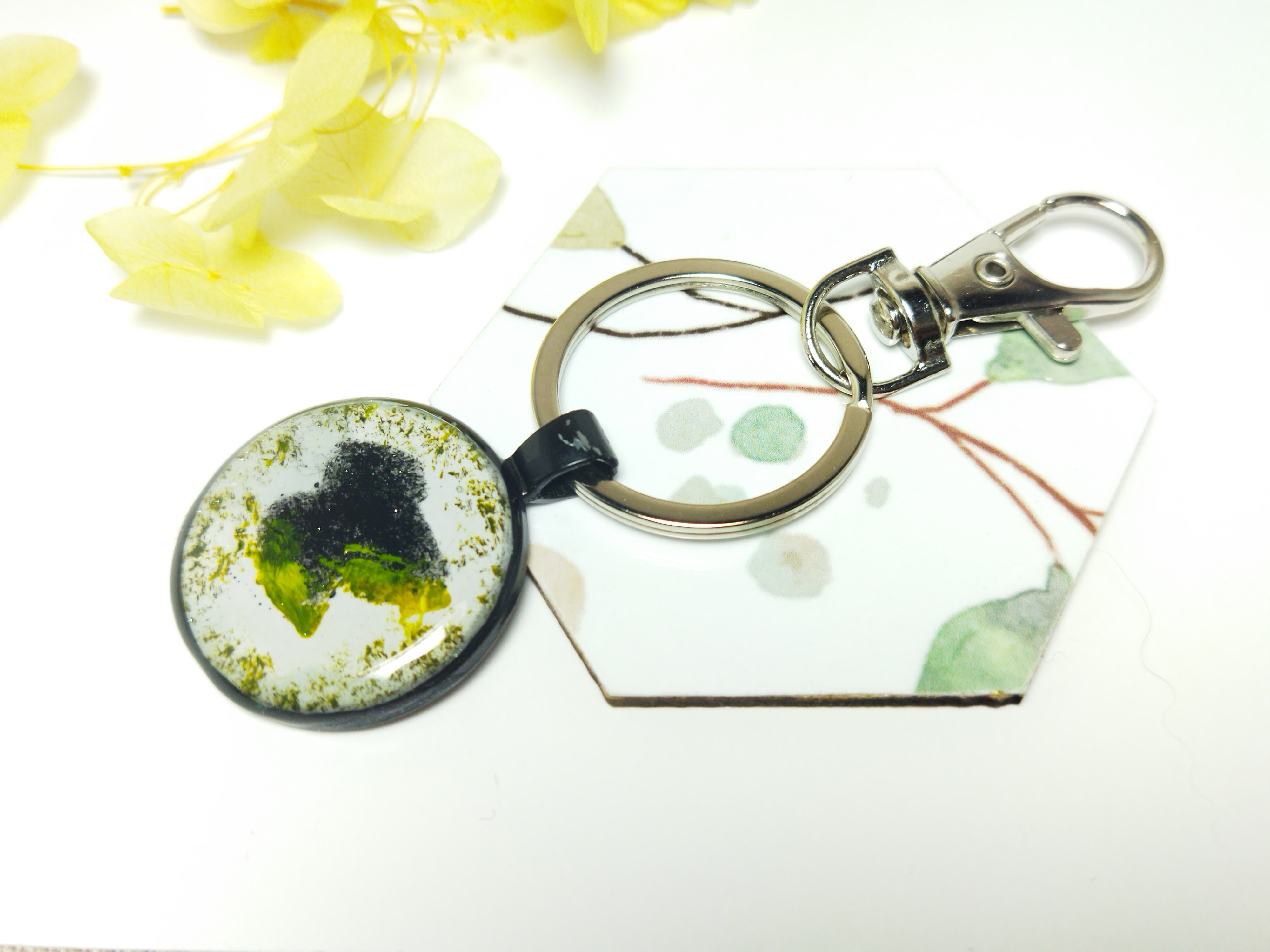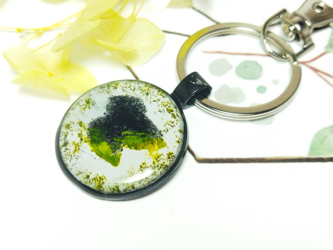 Emportez une part de nature avec vous, grâce à ce joli bijou de sac ou porte clés, orné d'un cabochon motif feuille, réalisé à la peinture gouache avec un pochoir, aux couleurs noir bordé de jaune fluo, sur un fond blanc bariolé.