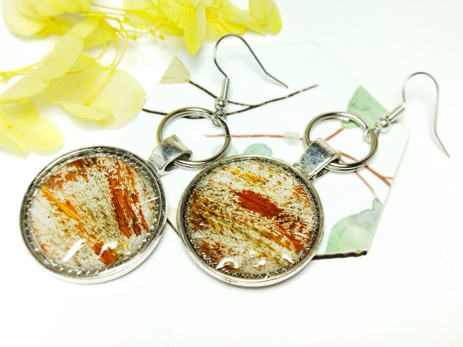 Boucles d’oreilles cabochons peinture gouache sous résine – acier inoxydable argent ancien