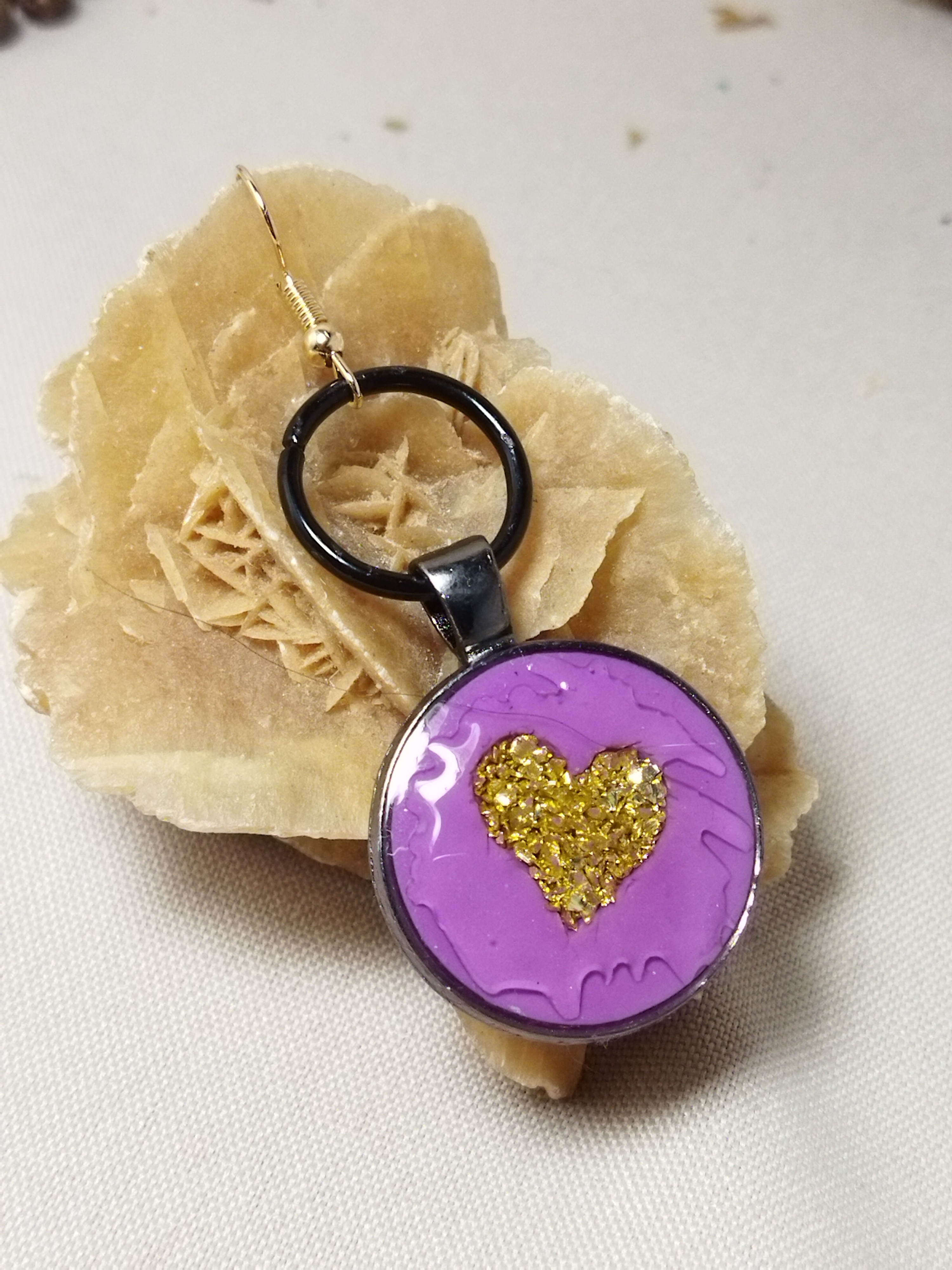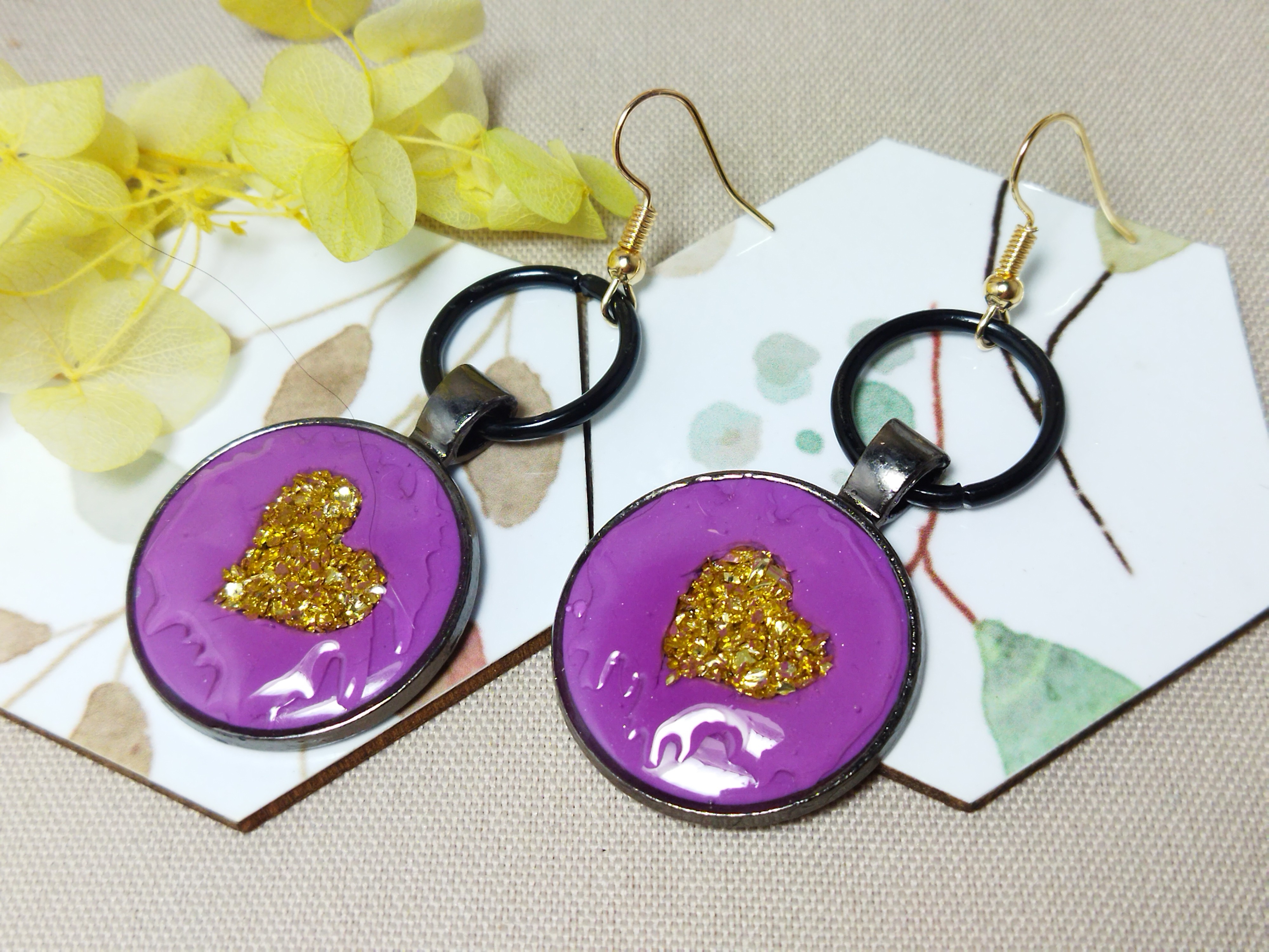 Boucles d’oreilles cabochons ronds cœur pailleté doré – fond violet, acier inoxydable or antique et noir