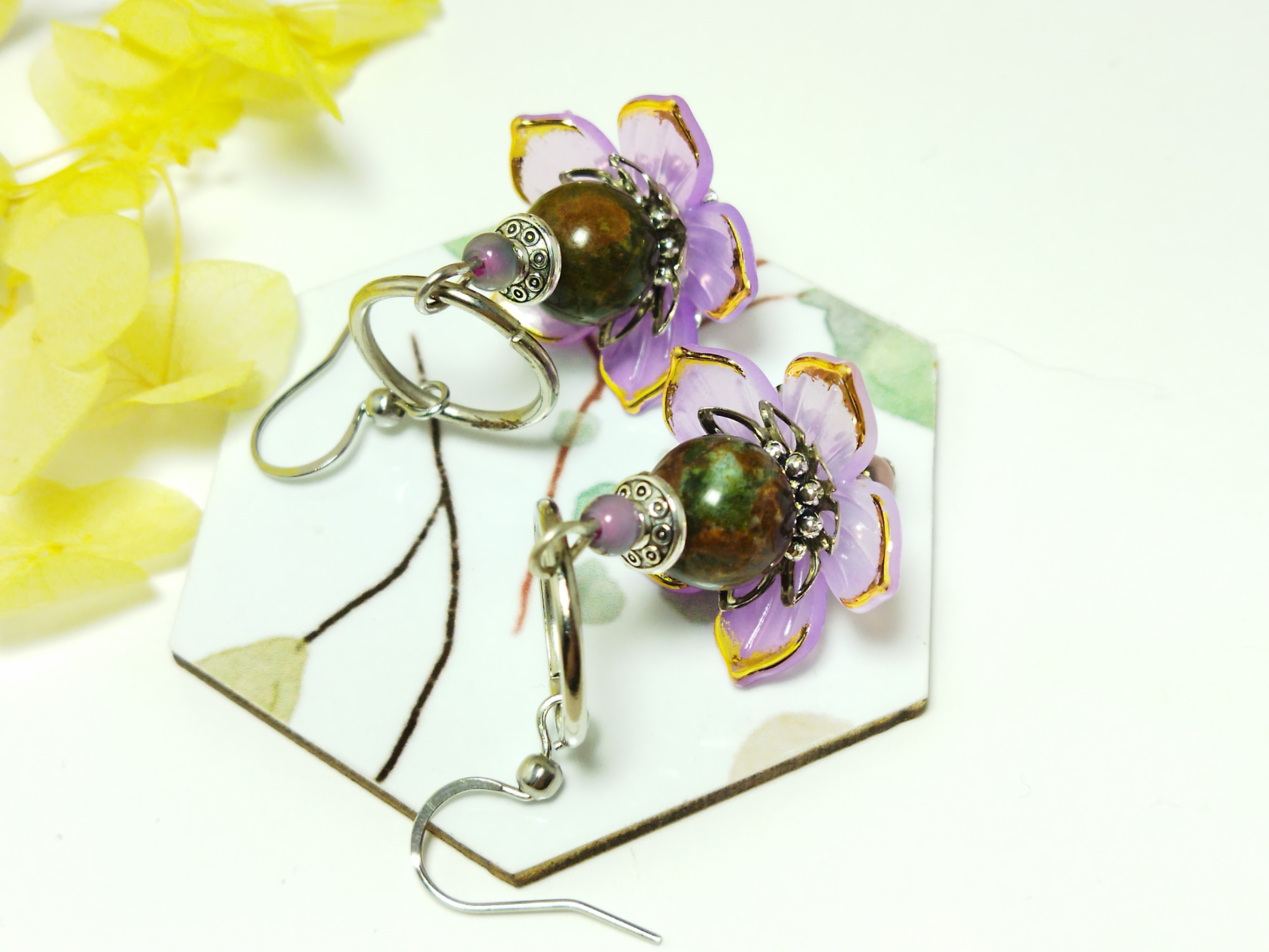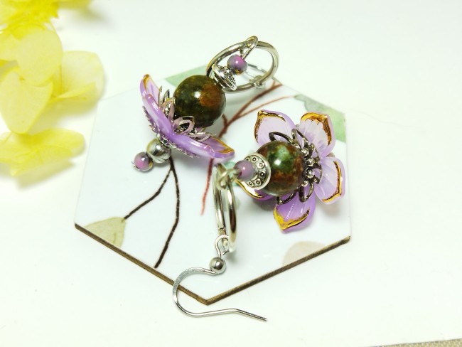 ✨ Boucles d’oreilles fleurs de lys mauve & Opale naturelle – Acier inoxydable