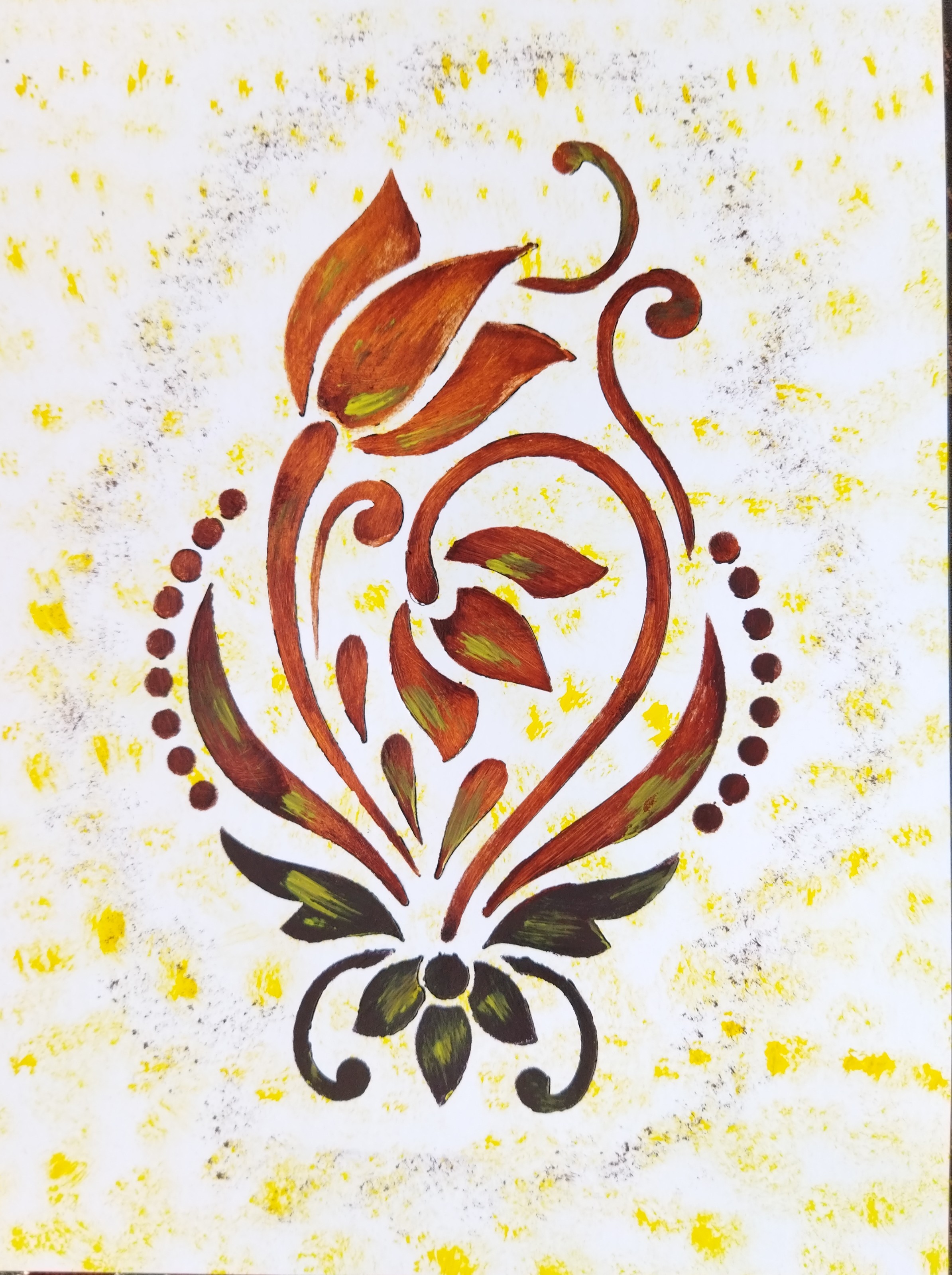 Ce dessin au pochoir représente des tulipes stylisées, peintes à la gouache dans des tons chauds de brun, rouge brique et vert nuancé. Les lignes courbes et le motif central donnent une composition à la fois florale et ornementale. Le fond clair, ponctué de touches jaunes, apporte lumière et contraste. Une œuvre décorative simple et expressive, inspirée de la nature.