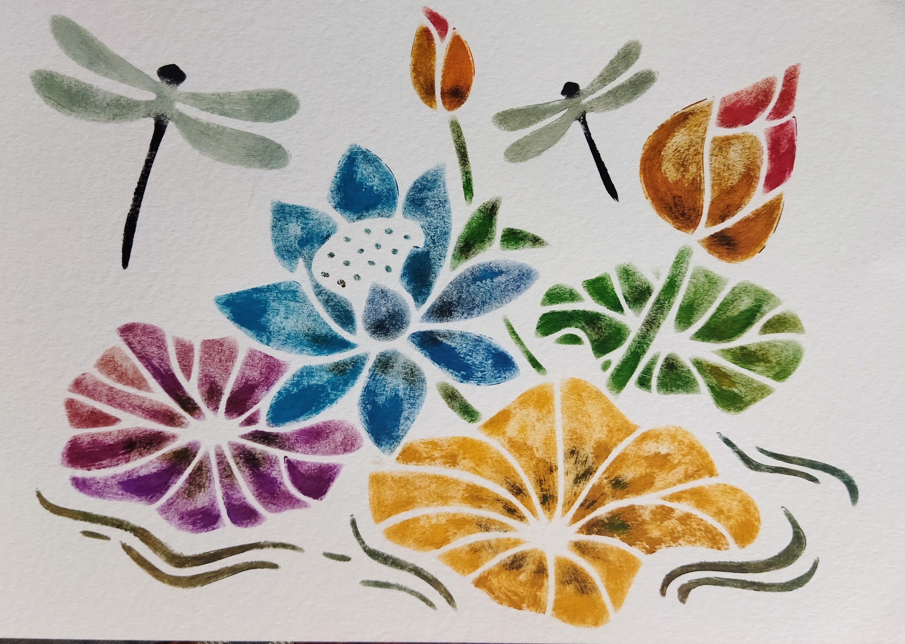 Cette composition florale réalisée au pochoir et à la gouache évoque un jardin imaginaire, libre et vibrant. Les fleurs stylisées aux couleurs intenses – bleu profond, violet, ocre solaire et vert végétal – dialoguent harmonieusement dans un équilibre entre douceur et vitalité.