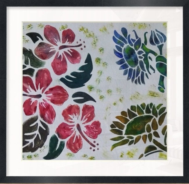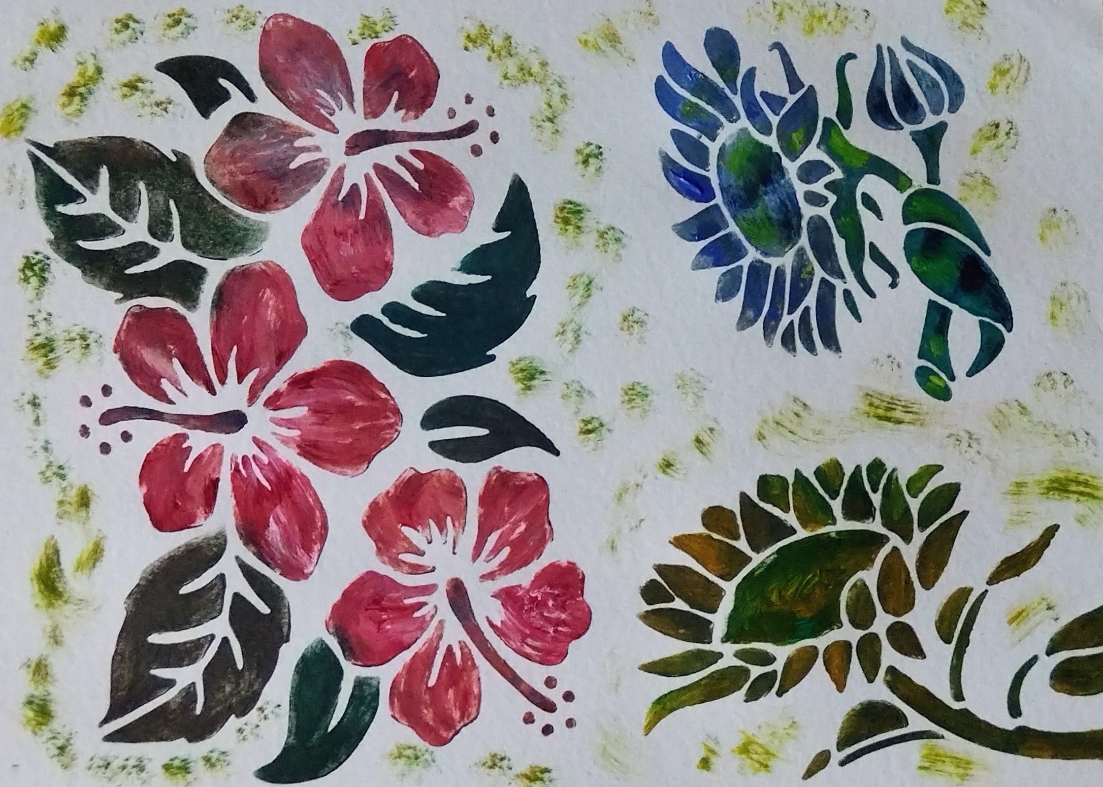 Ce dessin met en scène des fleurs stylisées réalisées au pochoir et peintes à la gouache, dans une composition joyeuse et contrastée. Les pétales rouges profonds dialoguent avec des fleurs bleu-vert et des feuillages aux nuances de vert et de brun, créant un rythme visuel riche et harmonieux.
