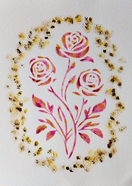 Le second dessin met en scène des roses rose et orangé, plus légères et aériennes, entourées d’un halo délicatement tamponné, évoquant une couronne lumineuse et poétique.