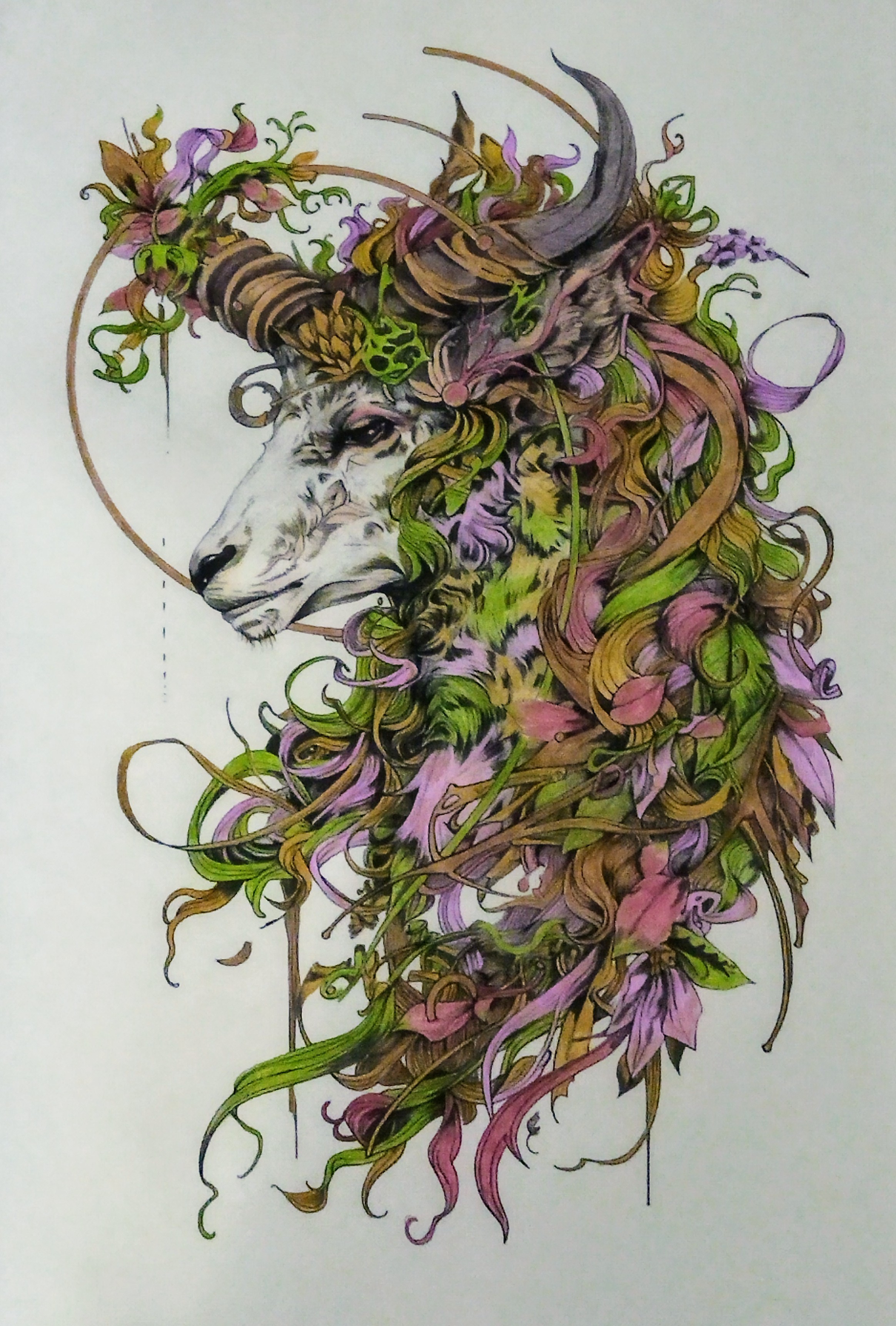 Dans cette œuvre minutieusement réalisée, un majestueux cervidé se dévoile comme une entité mystique, mi-animal mi-esprit de la forêt. Son regard calme et profond incarne la sagesse ancestrale, tandis que ses bois se transforment en une couronne végétale foisonnante.