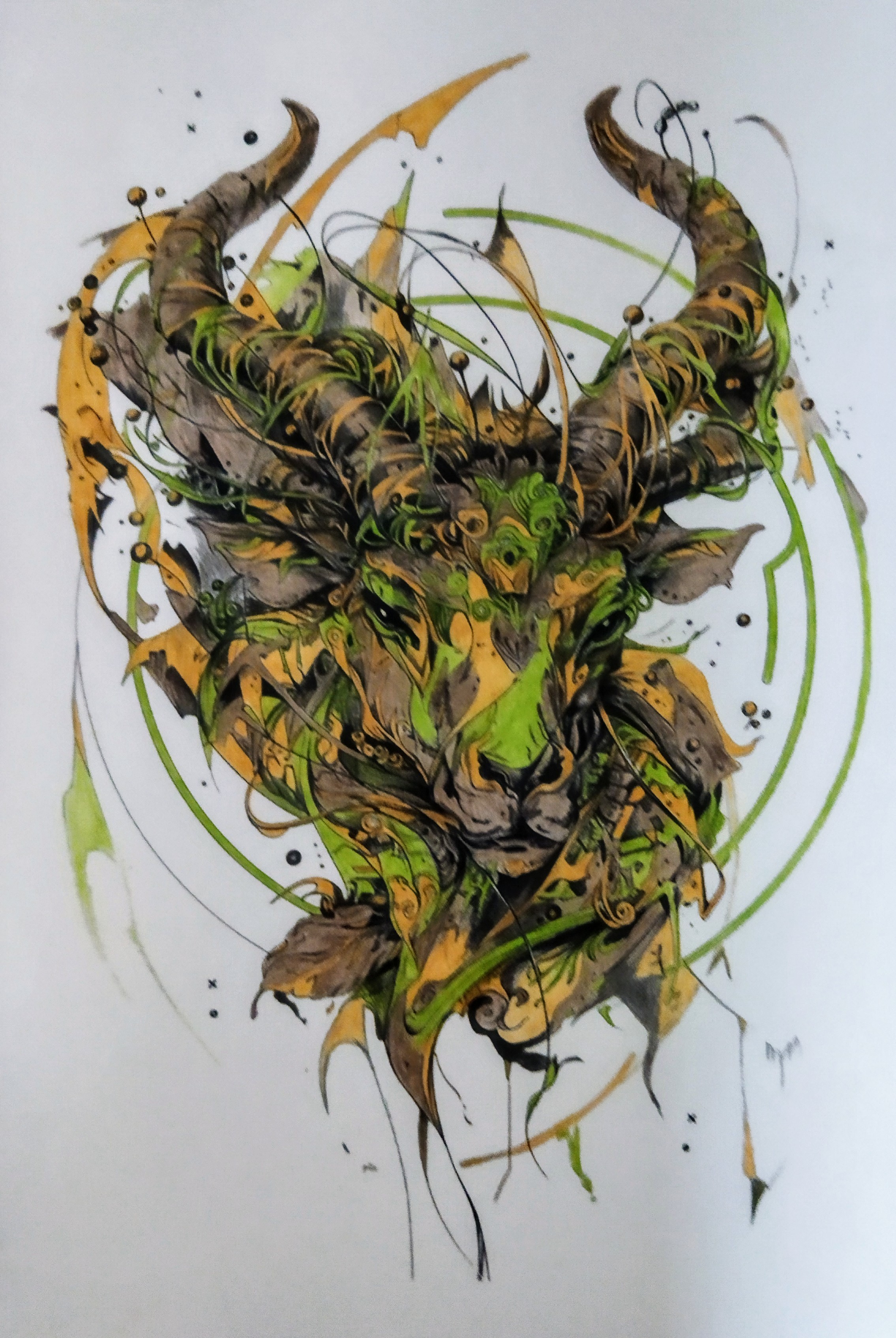 Les teintes vert acide et ocre doré se mêlent aux bruns terreux dans un jeu de contrastes intenses. Les éclats graphiques, projections et lignes dynamiques donnent à l’ensemble une énergie brute, presque sauvage. L’effet peinture obtenu aux crayons de couleur professionnels apporte une matière dense, vibrante, proche d’un rendu pictural.