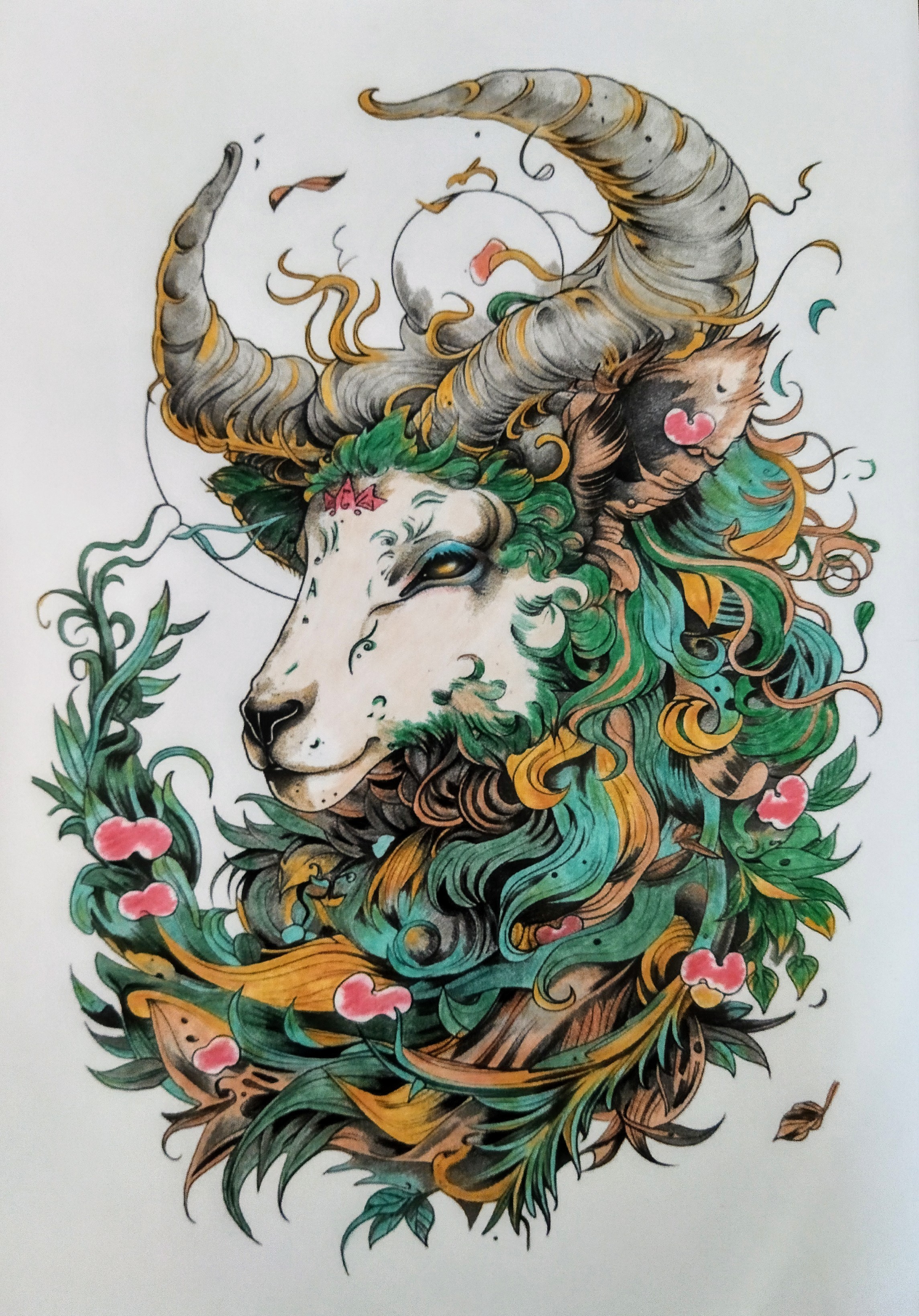 Ses cornes majestueuses aux reflets dorés s’entrelacent avec une chevelure végétale fluide, composée de feuillages émeraude et de touches florales délicates. Les nuances profondes de vert, d’ocre et de brun créent une harmonie organique, tandis que les détails minutieux du regard apportent une intensité presque magnétique.