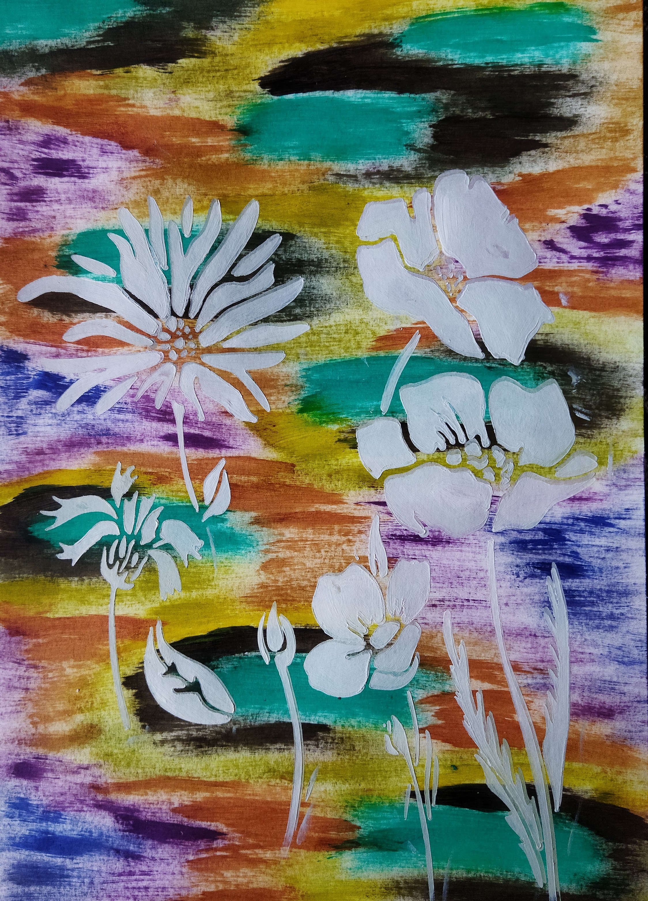 Ce dessin décoratif met en scène de fleurs blanches réalisées au pochoir, qui se détachent avec élégance sur un fond multicolore vibrant, peint à la gouache et à l’aquarelle.