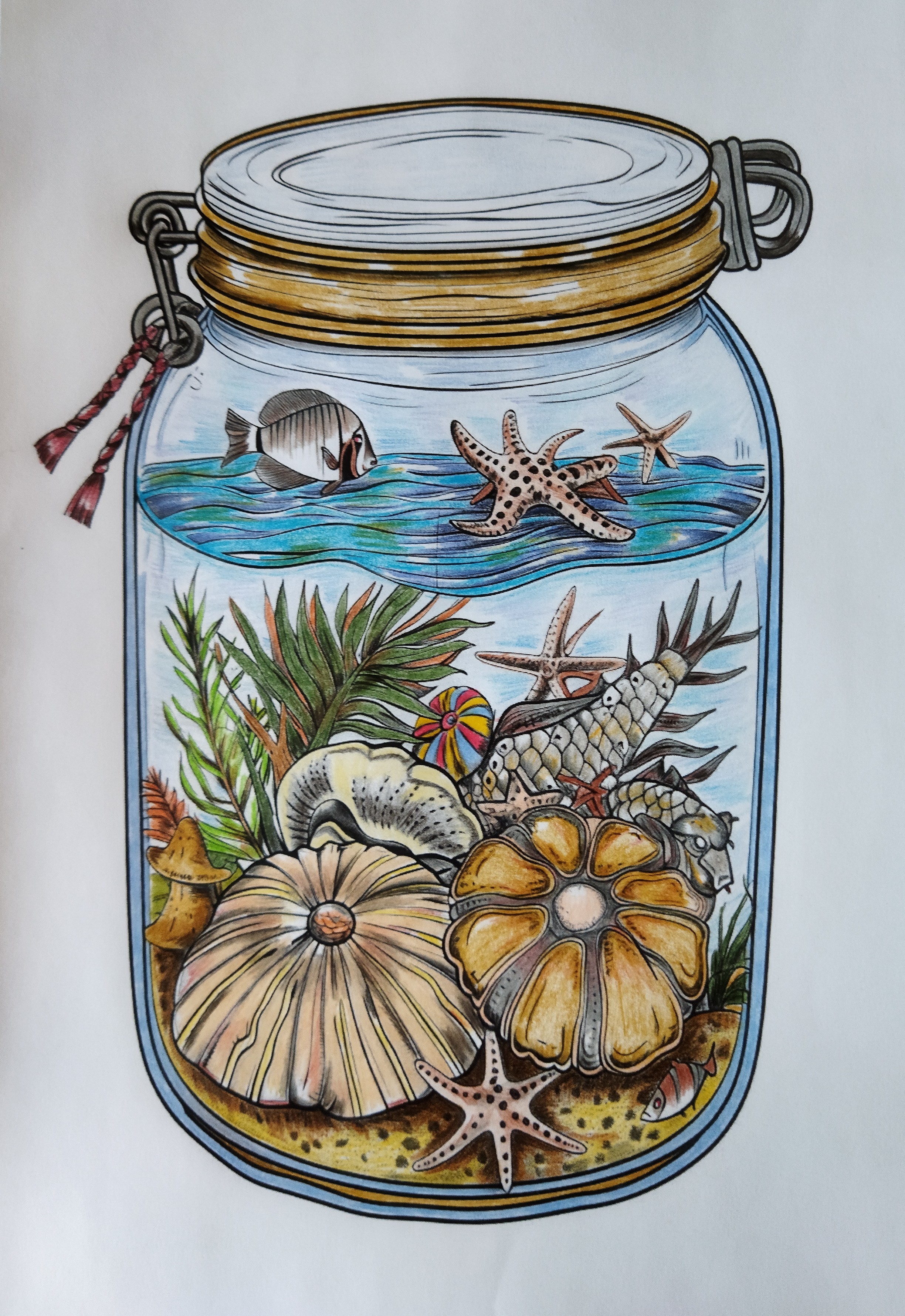 La transparence du bocal laisse apparaître les nuances bleutées de l’eau, tandis que les teintes sable, ocre et corail apportent chaleur et profondeur à l’ensemble. Réalisée aux crayons de couleur professionnels à mine huileuse, l’œuvre offre un rendu dense et lumineux, avec un effet proche de la peinture grâce aux superpositions et aux dégradés travaillés.