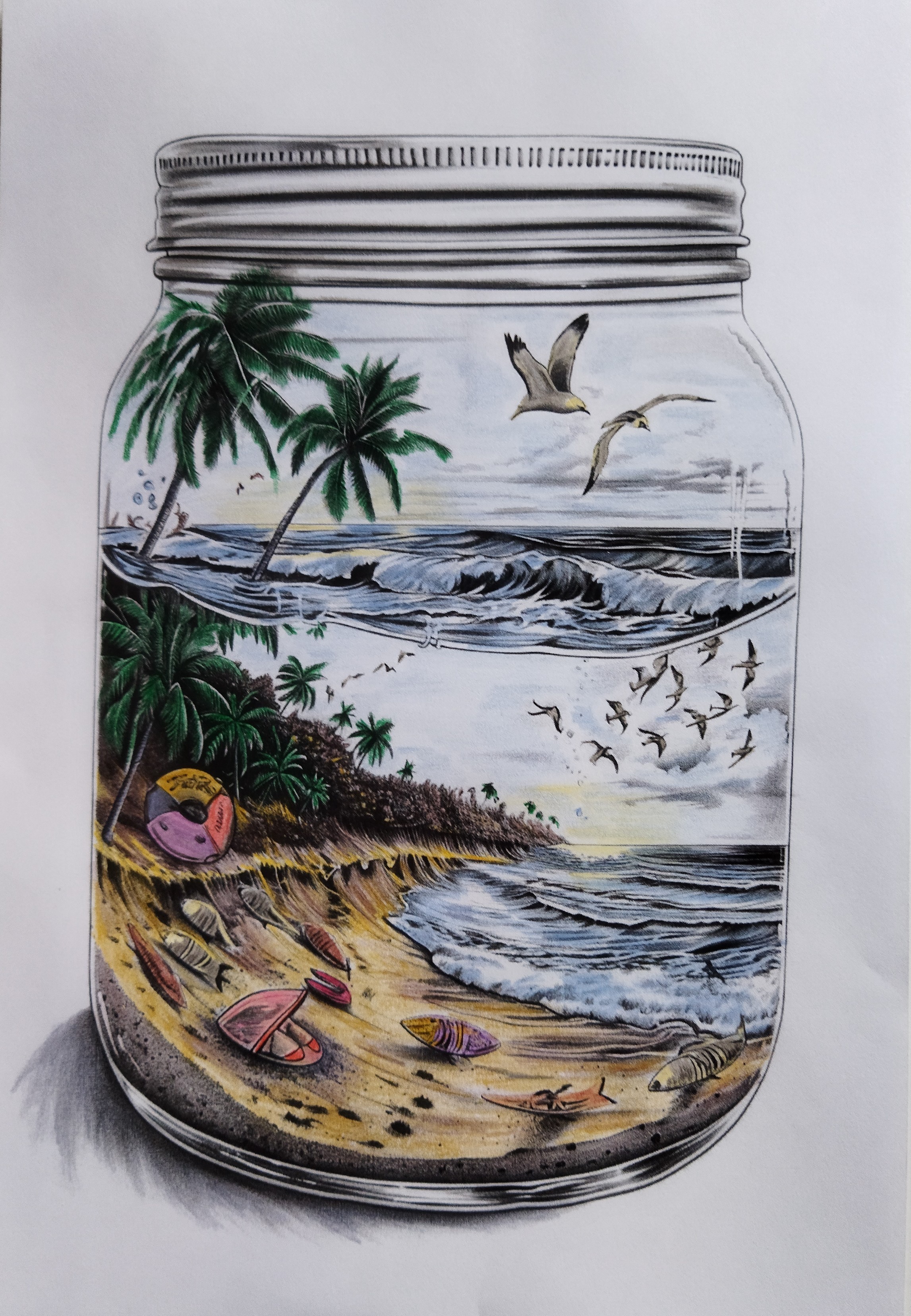 Réalisée aux crayons de couleur professionnels à la mine huileuse, cette illustration capture la puissance et la poésie d’un littoral tropical battu par les vagues. À l’intérieur du bocal en verre, la mer se déploie en deux horizons : une vague dynamique sous un ciel traversé d’oiseaux marins, et une plage dorée parsemée de coquillages et de bois flotté.