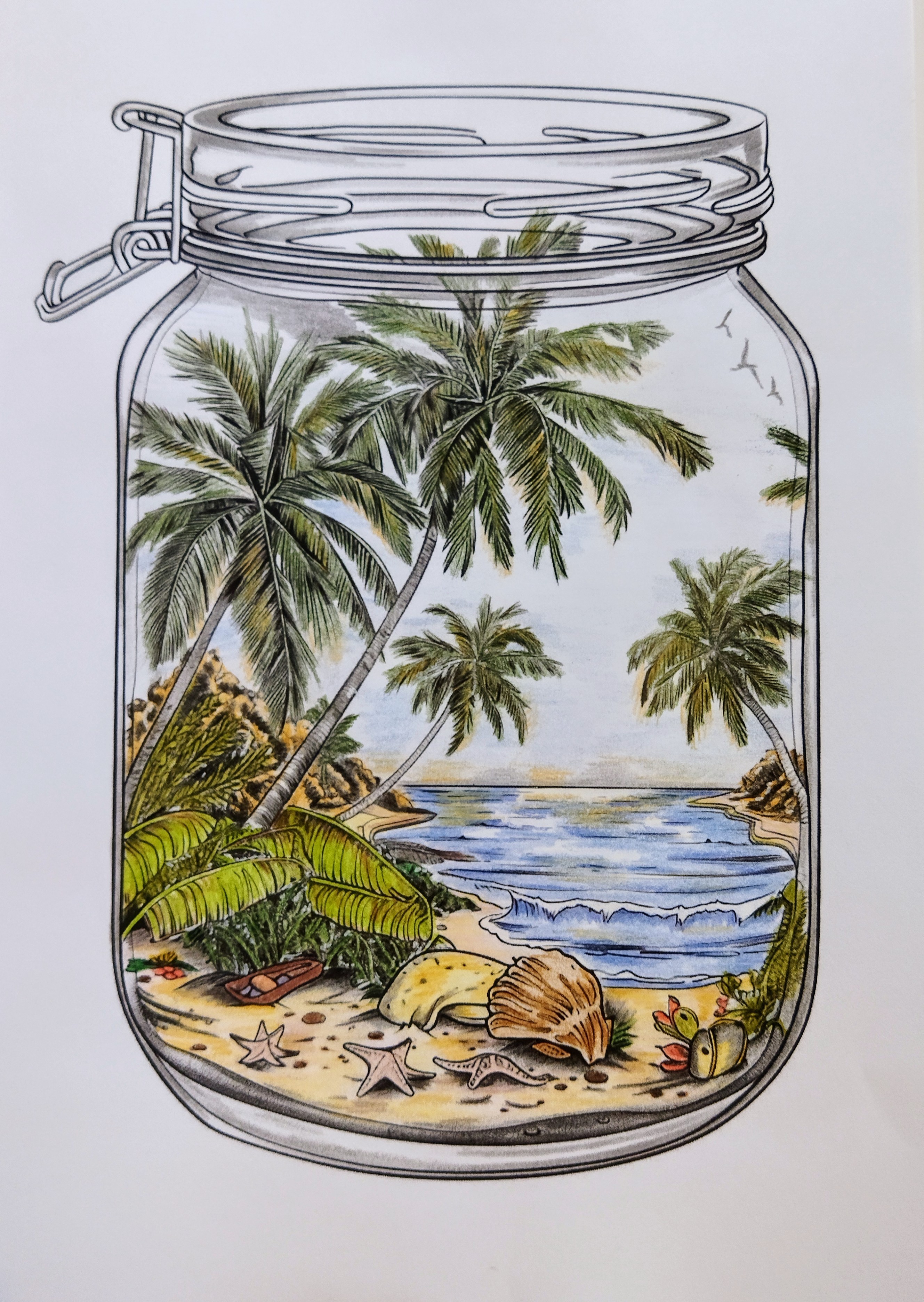 Réalisée aux crayons de couleur professionnels à la mine huileuse, cette illustration capture la quiétude d’une baie tropicale préservée. À l’intérieur du bocal, les palmiers élancés encadrent un horizon lumineux où la mer vient doucement s’échouer sur le sable doré.