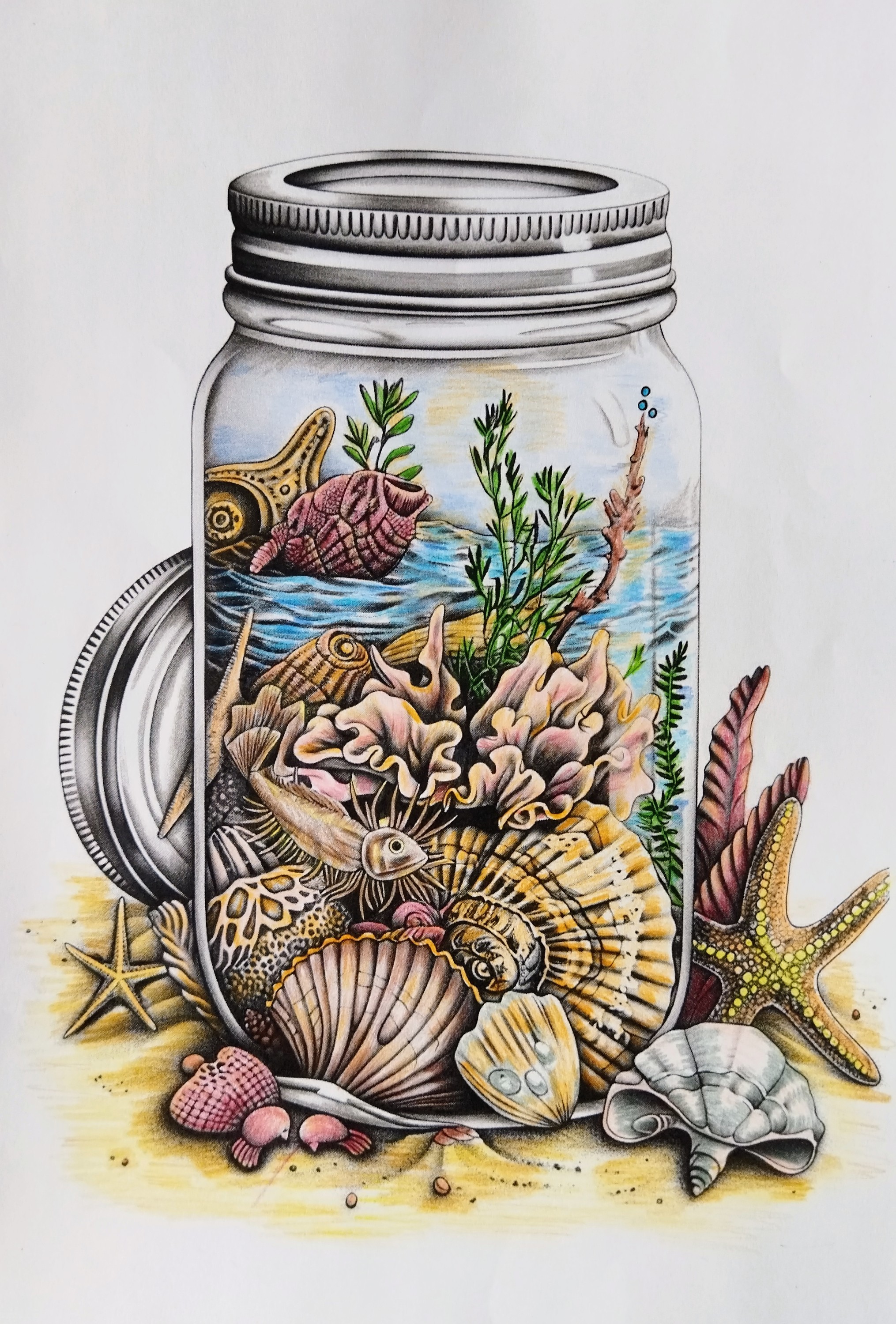Réalisée aux crayons de couleur professionnels à la mine huileuse, l’œuvre révèle un rendu intense et nuancé, proche de la peinture. Les jeux d’ombres, les dégradés subtils et le travail minutieux des textures donnent vie aux reliefs des coquillages et à la transparence de l’eau.