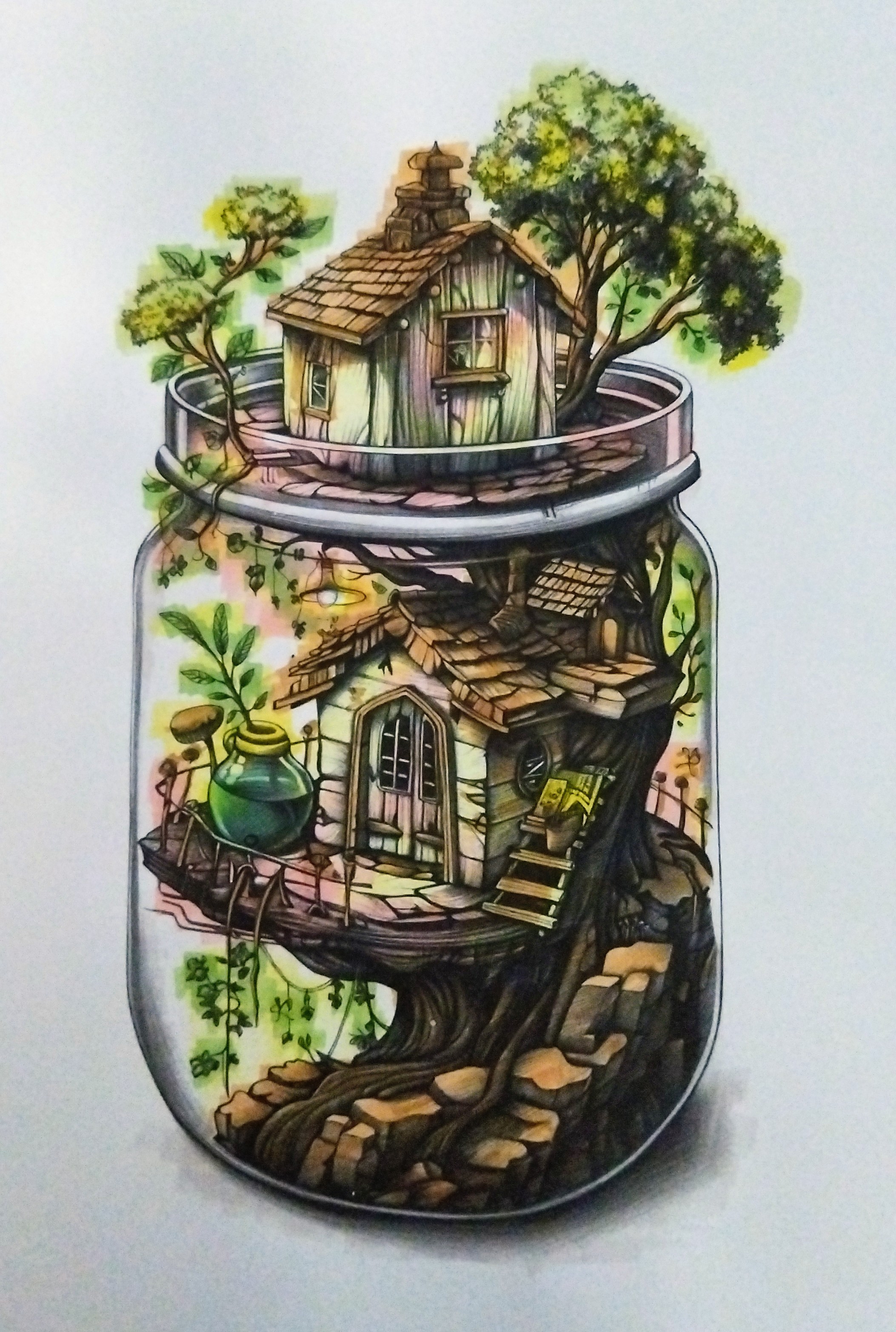 Cette illustration originale dévoile un monde miniature suspendu dans un bocal de verre : une maison perchée au cœur d’un arbre majestueux, comme un refuge secret hors du temps.