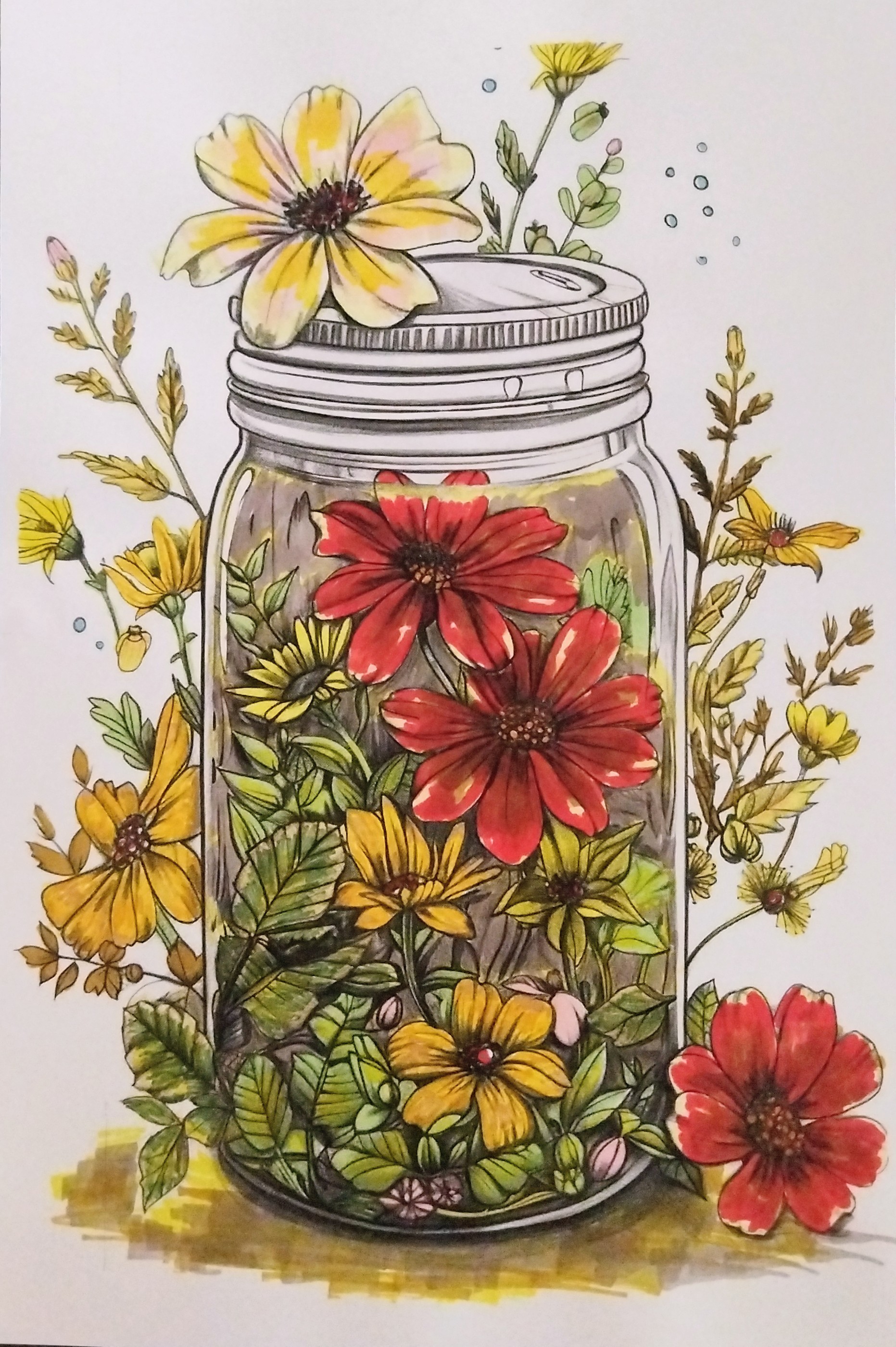 Réalisée aux feutres, cette œuvre révèle une intensité de couleurs vibrante et lumineuse. Le travail des ombres et des superpositions donne de la profondeur au verre et met en valeur la transparence du bocal.