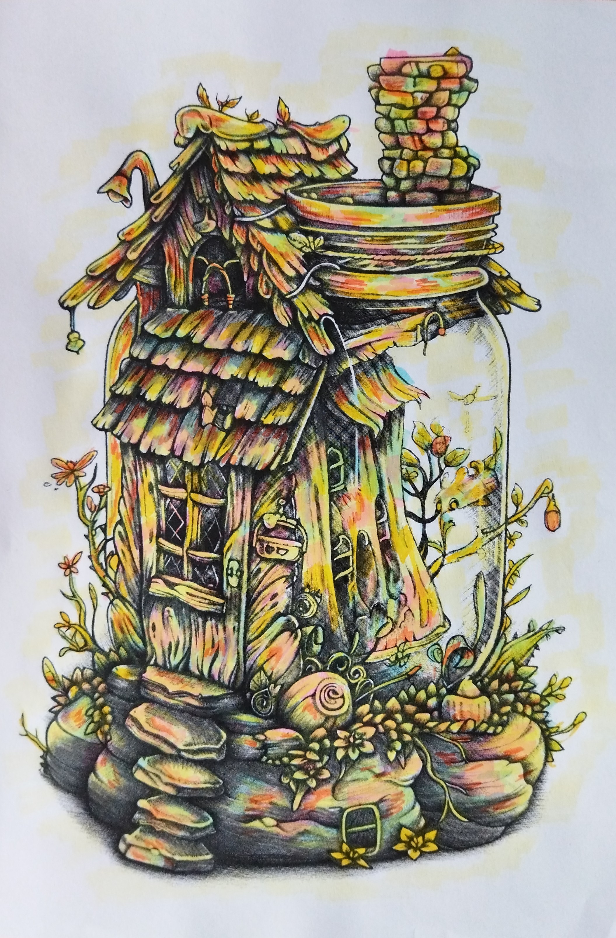 Comme sortie d’un conte, cette petite maison aux toits texturés semble avoir été façonnée par la nature elle-même. Installée dans un bocal protecteur, elle repose sur un socle de pierres moussues, entourée de feuillages délicats et de petits détails enchanteurs. Les couleurs vibrantes — jaunes lumineux, verts profonds, touches orangées et nuances pastel — donnent vie à cette scène féerique.