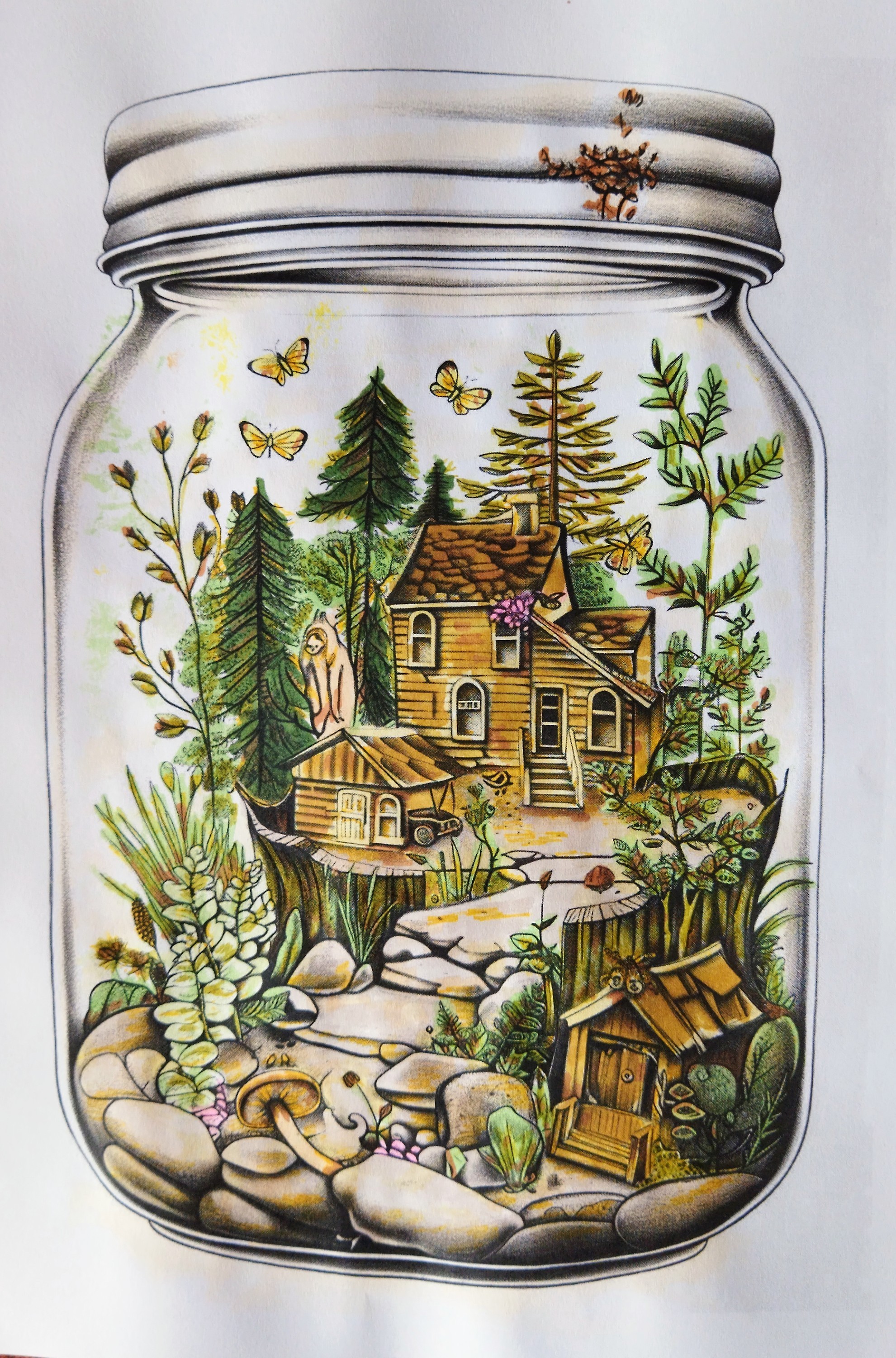 Dans un écrin de verre délicatement dessiné, une maison en bois s’élève au cœur d’une clairière paisible. Entourée de grands conifères, de pierres polies par le temps et d’une végétation foisonnante, la scène respire la sérénité et la douceur. Des papillons lumineux viennent animer l’atmosphère, comme une promesse de vie et d’harmonie.