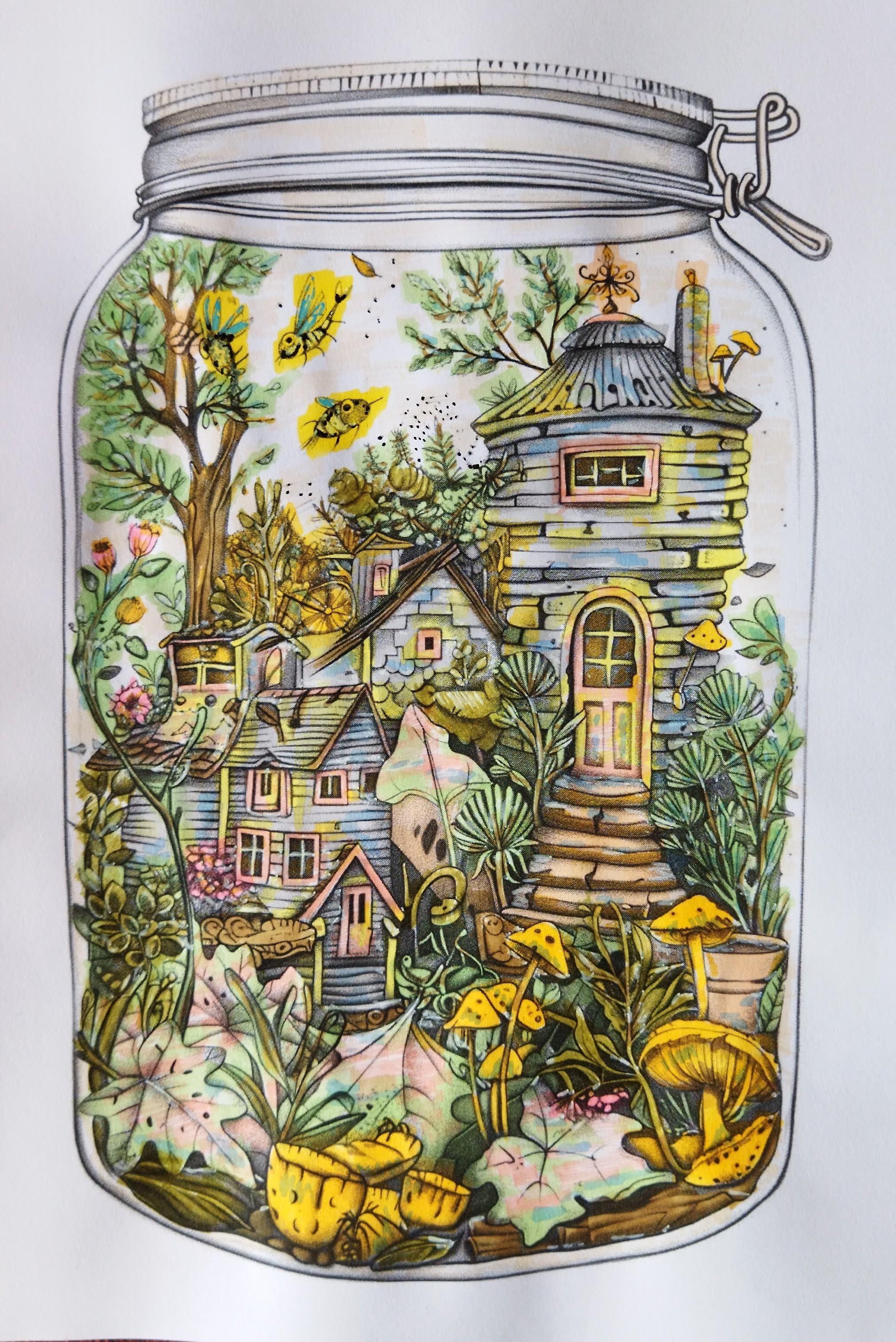 Réalisée aux feutres professionnels, cette œuvre révèle un travail précis des lignes et des contrastes, associé à des superpositions colorées vibrantes. Les nuances vert tendre, jaune miel et bleu doux créent une atmosphère chaleureuse et vivante, presque onirique.