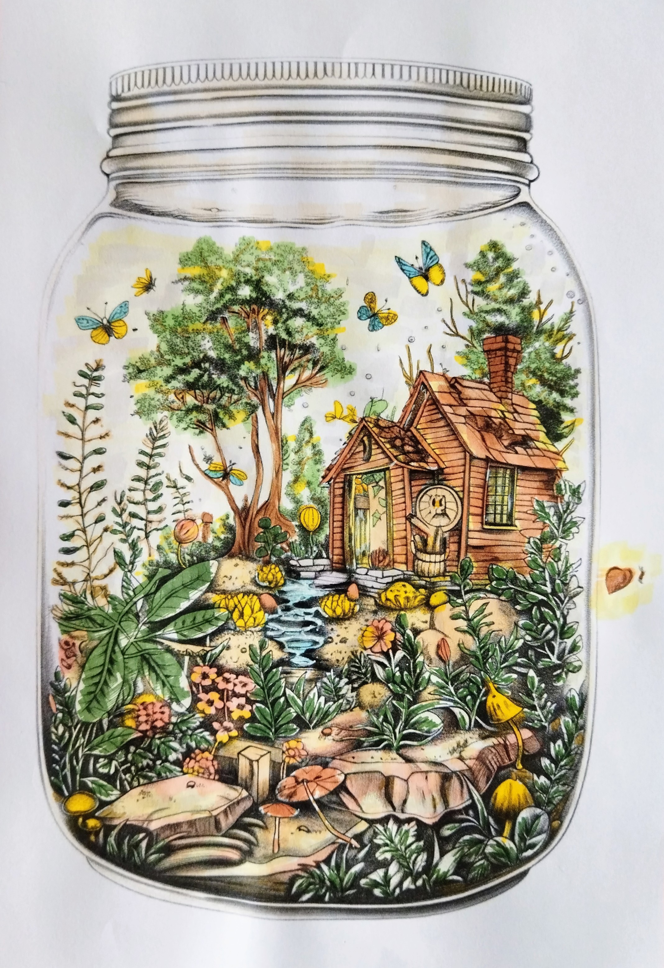 Dans ce bocal délicatement illustré, une petite maison en bois s’installe au cœur d’un jardin foisonnant. Un ruisseau serpente entre les pierres, des fleurs éclatent en touches jaunes et corail, tandis que des papillons légers dansent autour des arbres protecteurs.