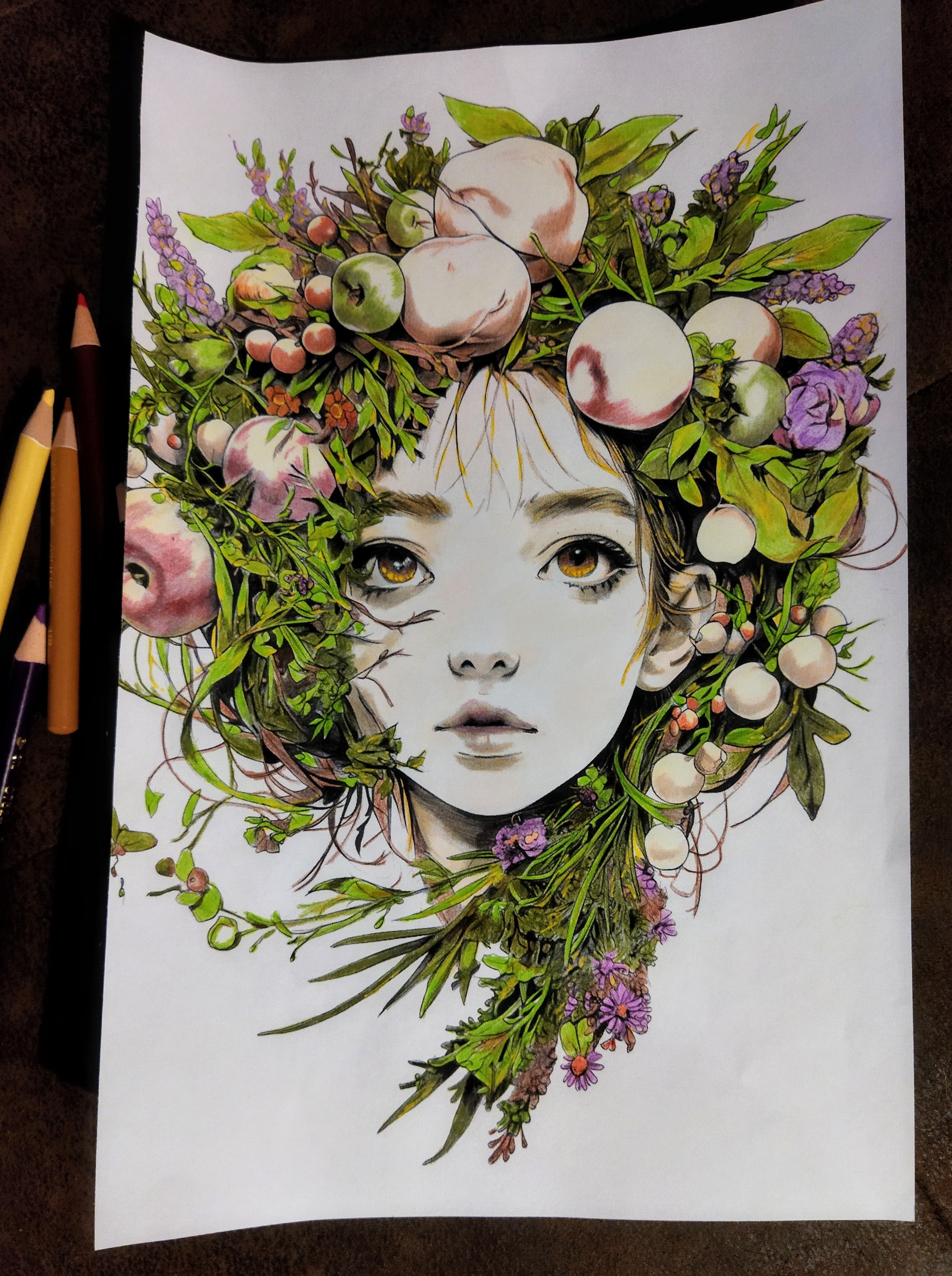 “Couronne d’Abondance” est une illustration originale représentant un visage féminin délicat, entouré d’une composition végétale luxuriante mêlant feuillages, fleurs sauvages et fruits aux teintes rosées et vertes.