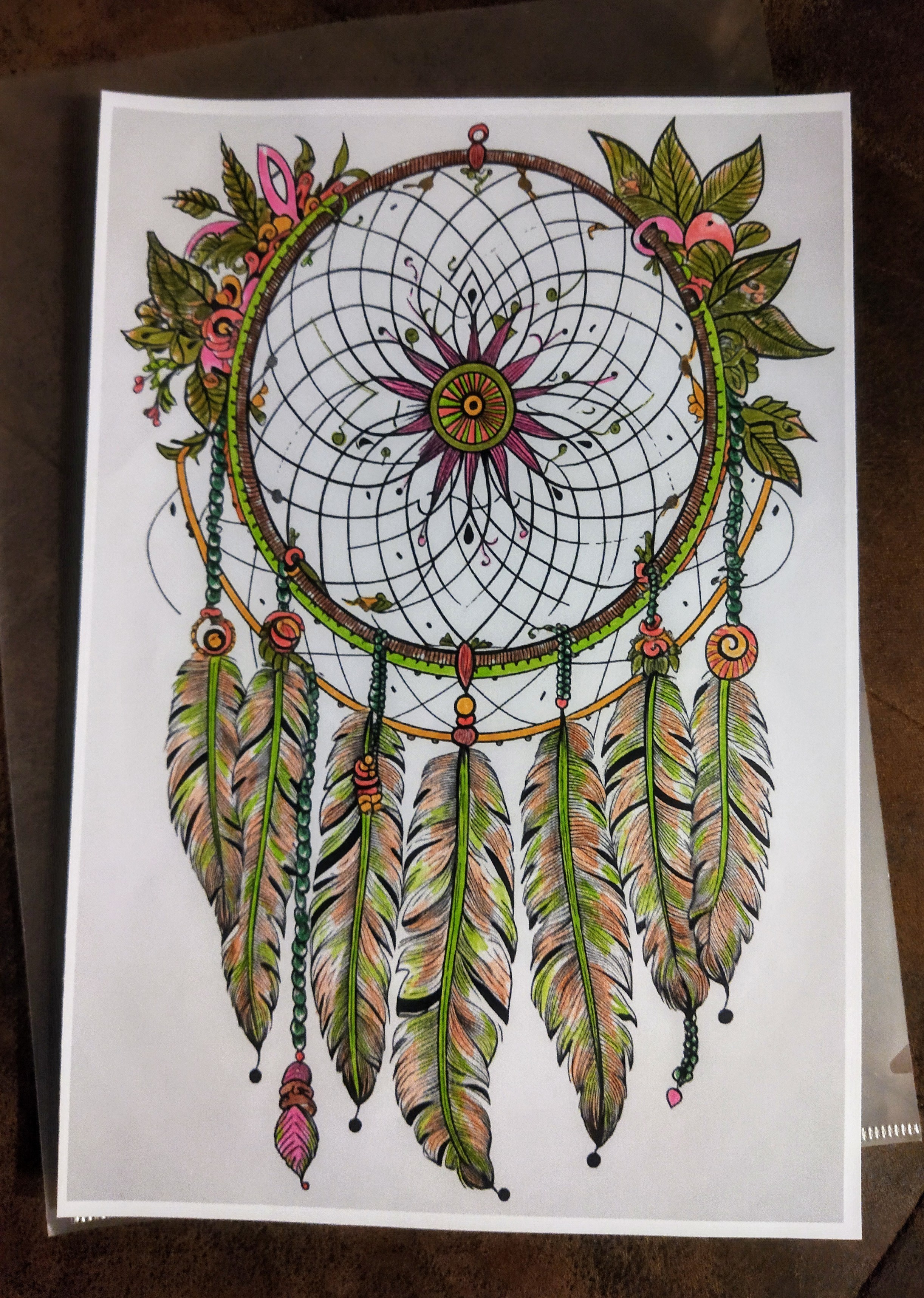 Au cœur d’un cercle délicatement tissé, une rosace florale rayonne comme une étoile intérieure. Les plumes longues et détaillées, subtilement nuancées de verts profonds, de bruns chauds et de touches rosées, descendent avec élégance, créant un mouvement fluide et apaisant.