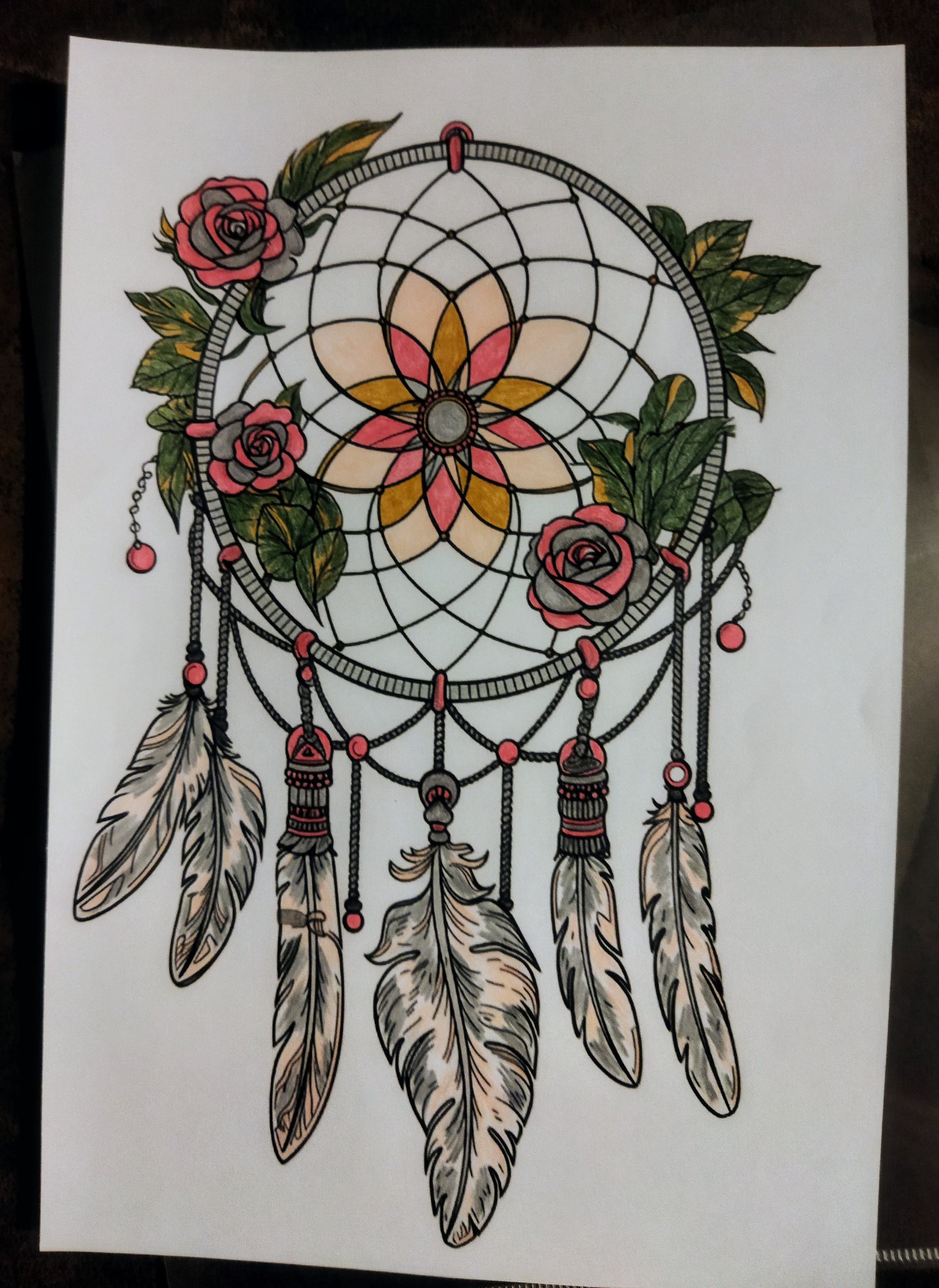 Au cœur de ce capteur de rêves, une rosace florale aux teintes chaudes de corail, de rose ancien et de doré rayonne avec douceur. Autour d’elle, un tissage délicat de lignes géométriques crée une sensation d’harmonie et de stabilité.
