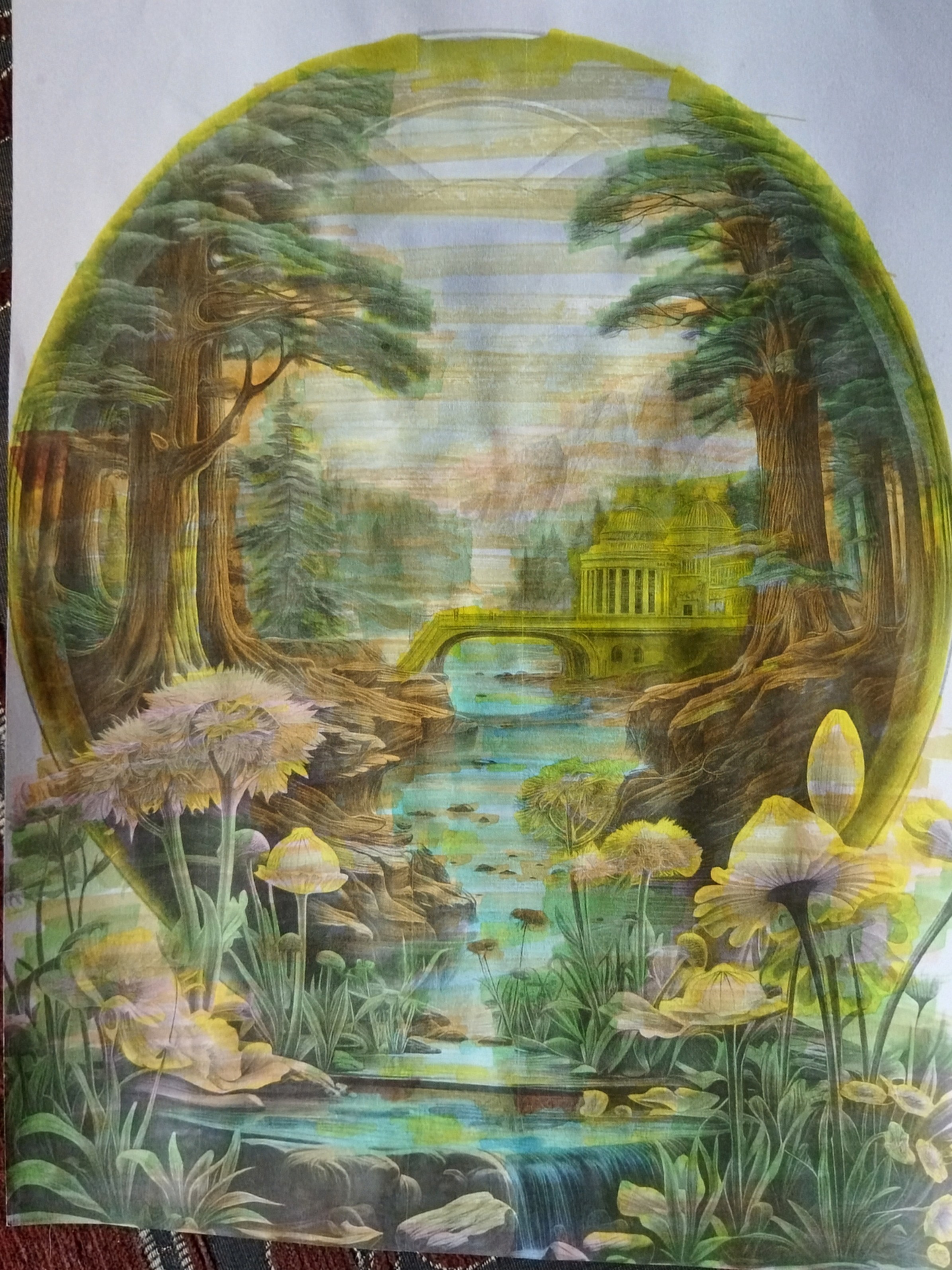 Le regard est guidé vers la profondeur du paysage, entre eau turquoise, feuillages vibrants et architecture mystérieuse. Cette illustration évoque la sérénité, la contemplation et le lien sacré entre nature et spiritualité.