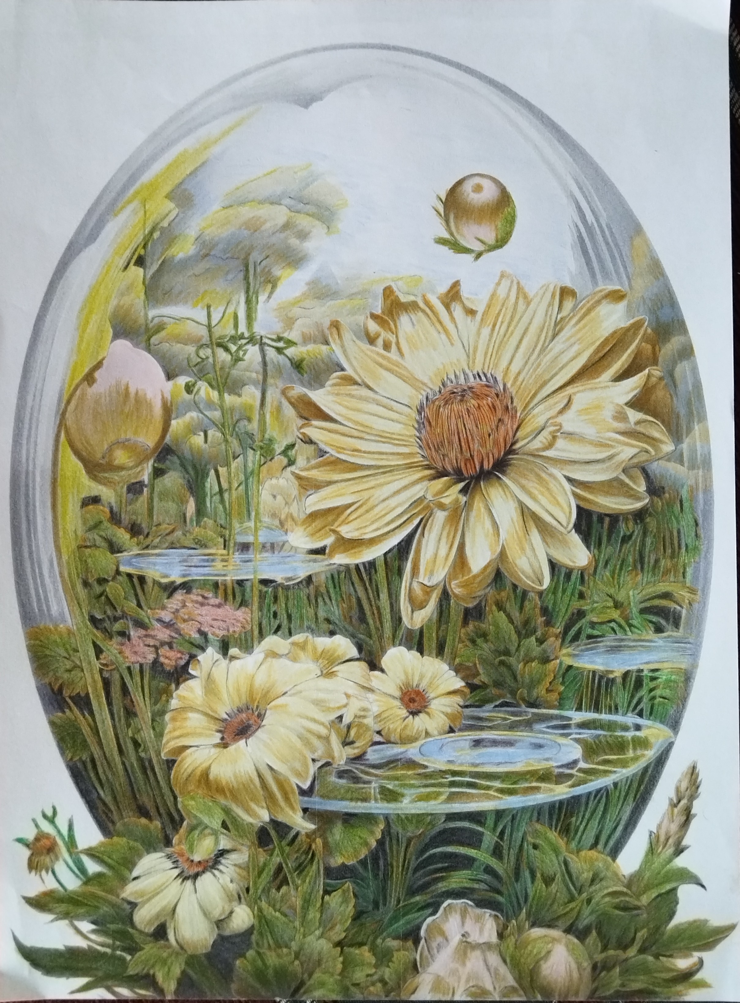 Dans un écrin de verre délicatement suggéré, une grande fleur solaire s’épanouit au cœur d’un paysage végétal apaisant. Autour d’elle, des pétales crème et miel dialoguent avec des feuillages profonds et des reflets d’eau cristallins.