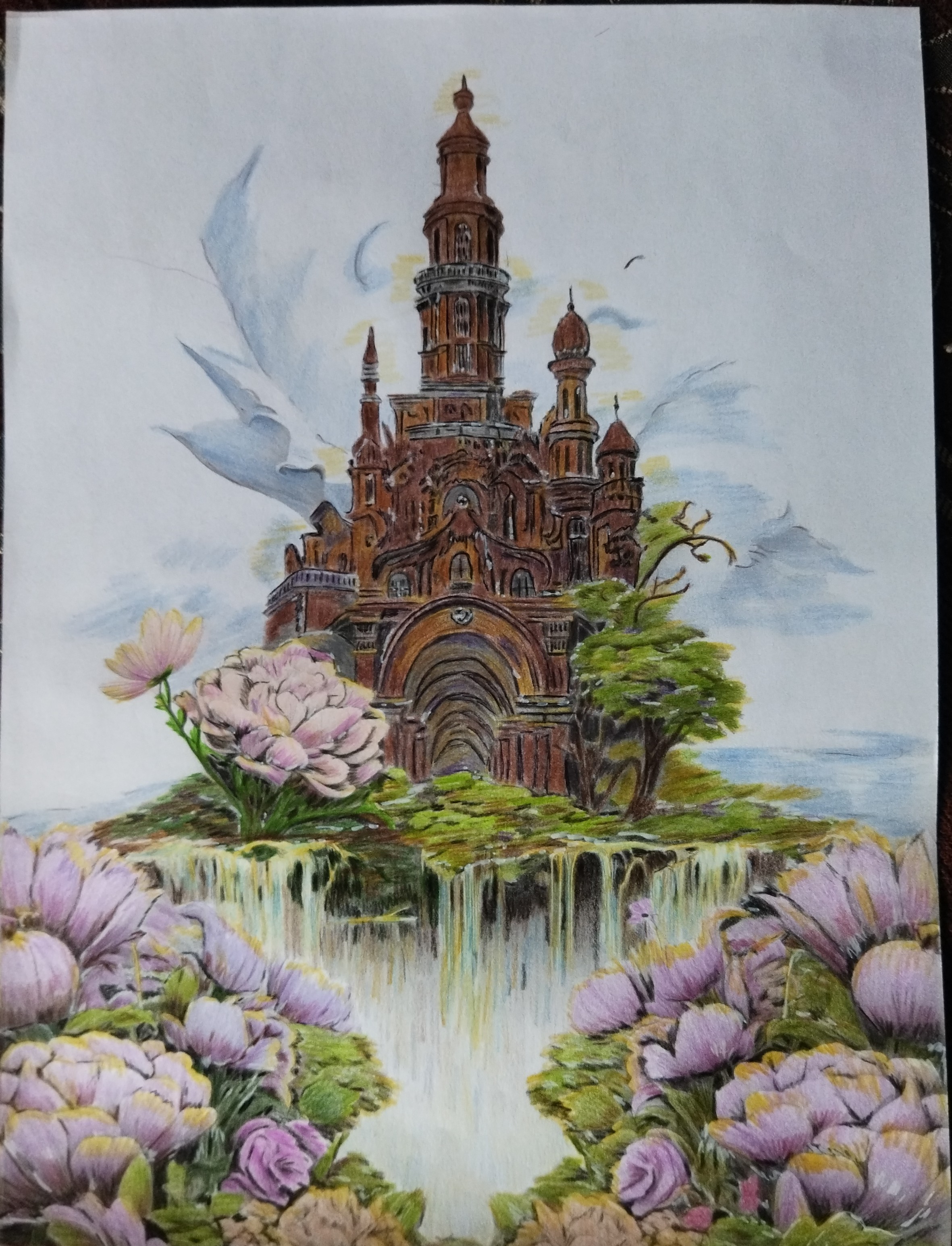 Au cœur d’un écrin floral délicatement teinté de rose poudré, s’élève un édifice majestueux, à la fois mystérieux et protecteur. Posé sur une île suspendue, bordée de cascades lumineuses, ce sanctuaire de briques chaudes semble flotter entre ciel et eau, comme un refuge hors du temps.
