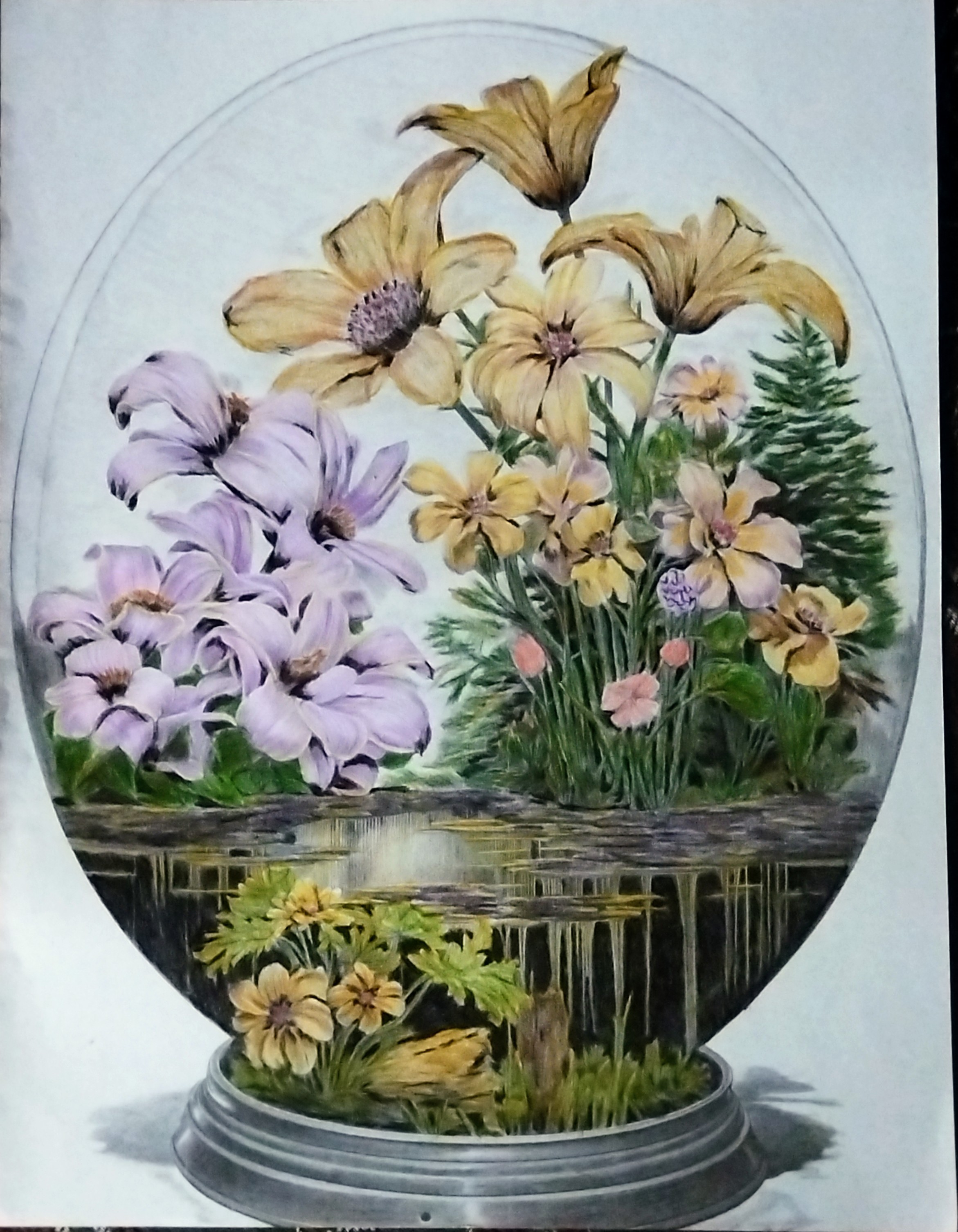 Sous une élégante cloche de verre, un jardin miniature prend vie : fleurs jaunes solaires, pétales lavande soyeux, feuillages denses et herbes fines composent une scène paisible et poétique.