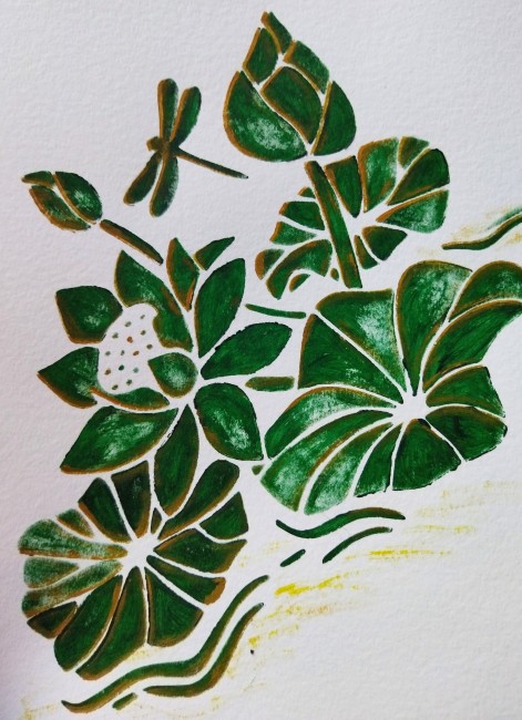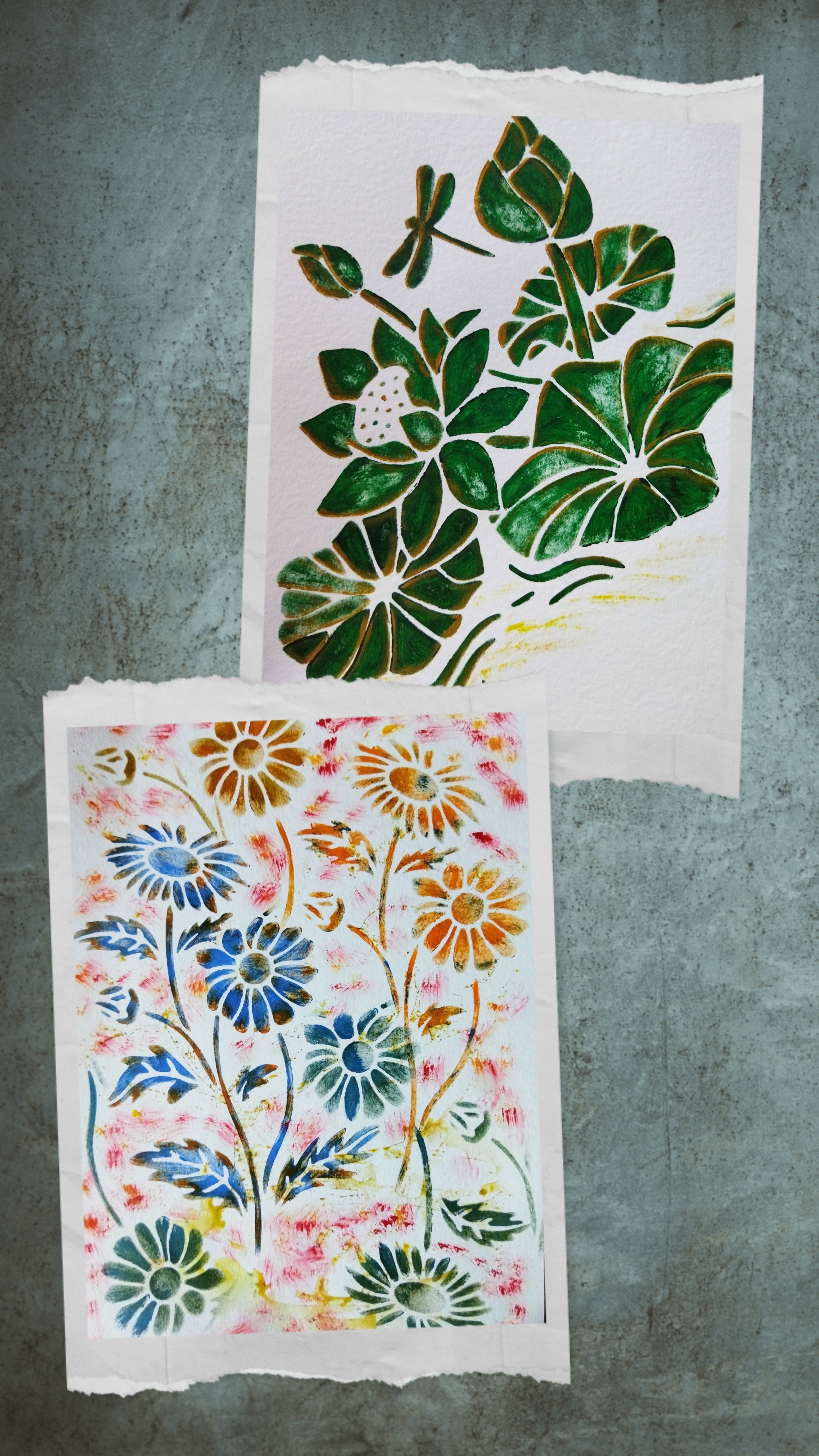 Ces deux œuvres complémentaires mettent en scène des fleurs stylisées et des feuillages graphiques réalisés au pochoir et à la peinture. La première composition évoque un jardin végétal luxuriant dominé par des teintes vertes profondes, tandis que la seconde illustration dévoile un bouquet floral coloré et lumineux, où les fleurs semblent danser dans un paysage imaginaire.