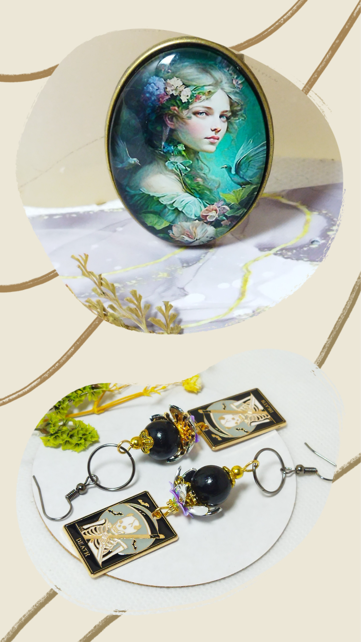 Dans cette collection, je vous propose des broches cabochons illustrées, des boucles d’oreilles ornées de perles, ainsi que des pendentifs en émail, choisis et assemblés avec soin.