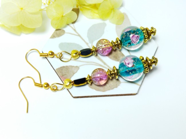 Boucles d'oreilles perles en verre fond turquoise, pailleté or, et fleurs roses