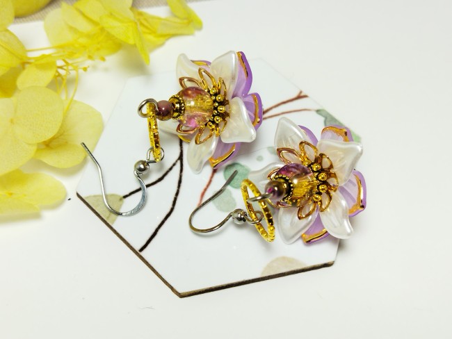 Boucles d'oreilles pendantes, perles en acrylique transparent fleurs violettes