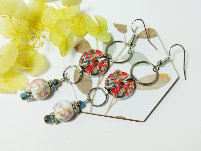 Boucles d'oreilles boutons fantaisie en bois multicolores, perles en céramique, illustration nature