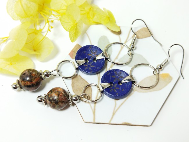 Boucles d'oreilles boutons fantaisie en bois bleu, pierres naturelles Jaspe Léopard