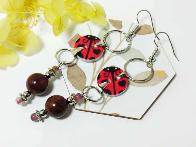 Boucles d'oreilles boutons fantaisie en bois motif libellule, pierres naturelles Jaspe Rouge