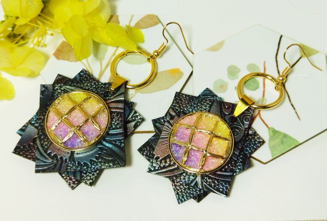Boucles d'oreilles boutons fantaisie violet dégradé sur un tissu en simili cuir aux reflets changeants