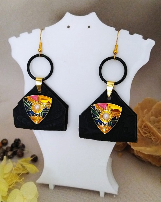 Boucles d'oreilles boutons fantaisie multicolore, tissu en simili cuir noir