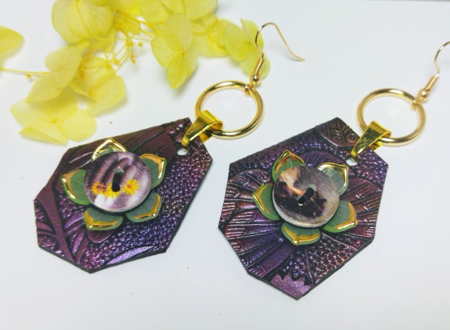Boucles d'oreilles boutons fantaisie en bois, tissu simili cuir aux reflets changeants mauves